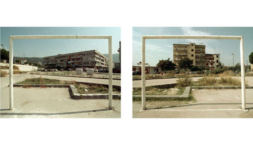 La seconda parte è dedicata a un catalogo, inteso non come semplice elemento accessorio, ma parte integrante ed essenziale dell’esposizione. Qui sono contenuti altri progetti come Strip (2005-2007), vere e proprie “strisce” realizzate scattando foto in successione, costruzione (architettonica) dopo costruzione, e incollate una dopo l’altra proprio come nella realtà e Fuoricampo (1997) una serie anch’essa basata sull’indagine del paesaggio (nella foto in alto), dove Di Bello sceglie di guardare ai luoghi periferici di Napoli tramite l’inquadratura offerta dalle porte dei campetti da calcio più o meno improvvisati e sparsi nella città.
