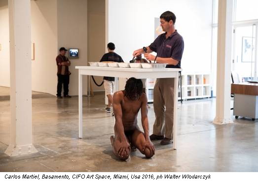 «Basamento è un’opera del 2015 che ho ricreato nella cornice di questa mostra. A quel tempo avevo lavorato con un’immigrata messicana, in questa occasione l’ho fatto con una haitiana. Basamento prende vita da due realtà differenti che però confluiscono nel contesto dell’immigrazione negli Stati Uniti, il privilegio di cui godono i cubani come immigrati e dall’altra parte l’invisibilità che vivono altre comunità di migranti latini. L’opera mette in discussione i parametri selettivi di cui tengono conto le autorità in materia di immigrazione negli Stati Uniti per accettare migranti o rifugiati politici. Qual è il ruolo che riveste ciascun immigrato qui? Dipende dalla sua nazionalità d’origine? Quanto contribuiscono all’economia di questo Paese i milioni di lavoratori immigrati illegali? Ho scelto di lavorare a Miami con haitiani perché i genitori di mio nonno materno erano haitiani, ed emigrarono a Cuba a metà del 1920 arrivando a Holguín scappando dalla povertà e dalla miseria. Questa versione di Basamento presenta dati biografici molto precisi, ma si inserisce in una realtà sociale che va ben oltre la mia storia personale».