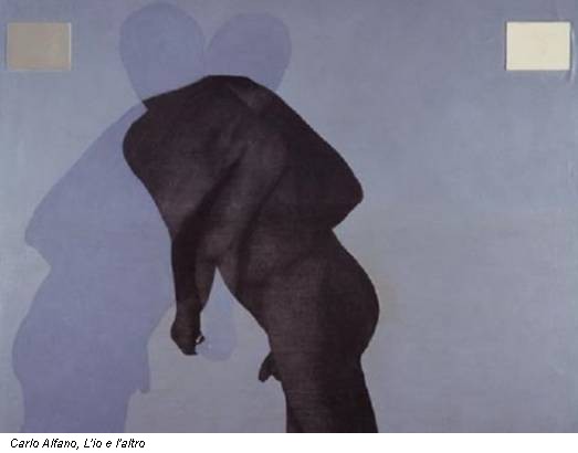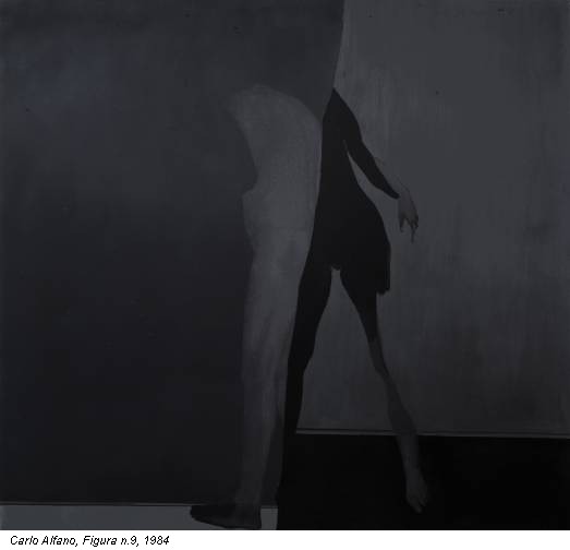 Proprio la scissione, come condizione di ambiguità e frattura dell’individuo, è l’altra tematica cardine dell’opera di Alfano, sempre racchiusa all’interno della ricerca della forma nello spazio. E i cicli più toccati da queste tematiche, Eco-Narciso, Eco-Discesa e Figure, sono presenti nella sala principale dello Studio Trisorio, con 5 opere di grandi dimensioni, realizzate nell’ultimo decennio produttivo dell’artista, dal 1980 al 1990. Alfano riprende i miti classici, ma li spoglia delle caratteristiche edonistiche: Narciso è colui che, nell’eco, perde ogni coordinata orientativa, diventando altro da sé; Eco è una voce che va oltre la sua fonte di origine, ha una matrice di partenza ma diventa riflesso e rifrazione. Le tele vengono divise in due parti speculari: sono l’una l’eco dell’altra, l’eco rimanda alla voce e viceversa. Come egli stesso ha sottolineato in più occasioni: «Nel mio lavoro è fondamentale il tema della duplicità, nel mio caso, il doppio non va inteso come sommatoria, bensì come condizione di ambiguità, in cui giocano il reale e il suo riflesso, alla fine tutto oscilla tra questi due falsi».