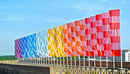 Buren ha contribuito con La scacchiera arcobaleno ondeggiante, una monumentale installazione di bandiere colorate che i romani possono ammirare ergersi sulla terrazza della Domus Severiana.