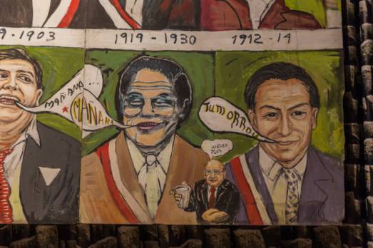 Questa stessa polemica era in gran parte il cuore del lavoro di Salazar che dai suoi esordi ha guardato criticamente alle istituzioni – non soltanto del sistema dell’arte – dedicandosi ad indagare le problematiche storico-sociali che ancora oggi trovano eco nella società peruviana. Residui, rimanenze, tracce di un passato coloniale che condividono i Paesi dell’America Latina e che si riattualizzano in carne ed ossa nelle geografie economiche e sociali che ancora oggi sono espressione di profonde fratture anche di classe. Attraverso l’ironia e la parodia, ma con un profondo senso della storia e della dimensione complessa del presente, Salazar restituisce attraverso le sue opere, dalle sculture ai dipinti, dalle performance ai video, domande fondamentali che obbligano a guardare con occhi critici dilemmi mai risolti e riconosciuti dall’artista come fondanti della Repubblica del Perù. In questo senso, sono particolarmente significative le opere esposte al padiglione tra cui spicca Perú, país del mañana [Land of Tomorrow] (2006), un dipinto di grandi dimensioni in acrilico su cartone di fibra in cui i governanti locali, dall’indipendenza dal governo coloniale nel 1821 in poi, pospongono per domani i grandi progetti del Paese. Di un tono ancora più sarcastico è il video di sei minuti Perú Express (2006) in cui l’artista stesso proclama a viva voce: «Non voglio interrompere il vostro viaggio né la vostra gradevole conversazione…ma così come tutti i governi vendono il Perù a pezzettini io vorrei offrirvi un Perù…Quanto costerebbe in qualsiasi galleria d’arte? Oggi siccome è festa nazionale ve lo offro a ciò che volete darmi, non è un business, si tratta di una formula istantanea per mettere il Paese nelle mani dei suoi cittadini».