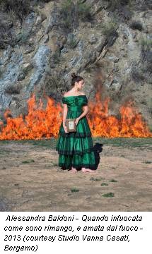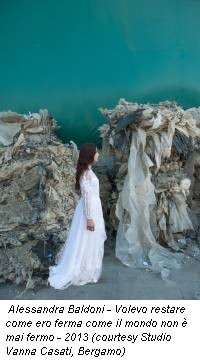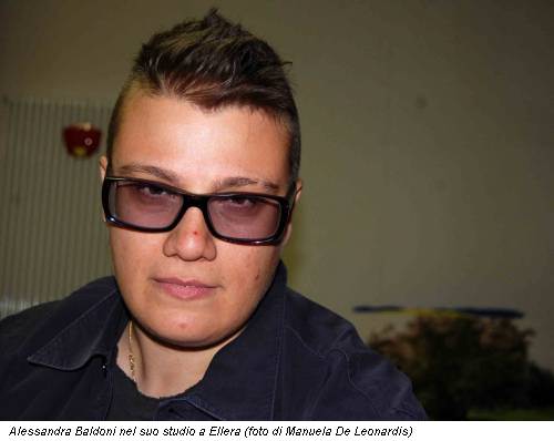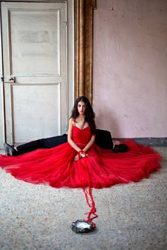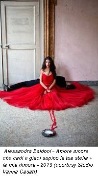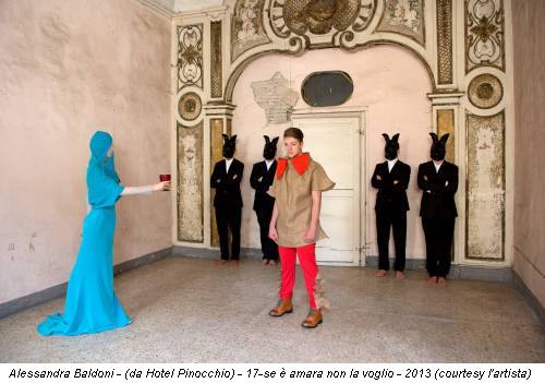 La bombetta rossa è poggiata sulla cappelliera, sopra una vecchia sedia di legno dipinta di rosa. Un paio di scarpe rosse con i lacci, una parete rossa, il cappottino rosso, il rosso del vestito che indossa una figura femminile nella serie fotografica Salva con nome che, lo scorso autunno, aveva dato il titolo alla personale presso la galleria Vanna Casati di Bergamo. È innegabile che per Alessandra Baldoni (Perugia 1976) il rosso sia un colore significativo, intriso di significati noti che vengono interiorizzati creando uno sconfinamento continuo tra arte e vita. Ma non c’è solo il rosso nello studio dell’artista a Ellera (Perugia), a pochi chilometri dalla sua casa. Una parete è gialla, un’altra azzurra, poi c’è il verde pisello dello scolapasta, l’azzurro del termosifone, il turchese del divano… colori che illuminano il seminterrato, sottolineando anche una presenza giocosa e allegra.