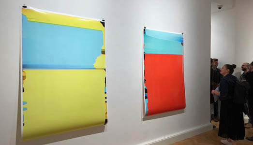 «In un certo senso il processo dell’ultimo lavoro [The Long Thing] è opposto a quello precedente [The Failed Entertainment]. Se in A Failed Entertainment trattavo l’intrattenimento – qualcosa che di solito è piacevole – con un atteggiamento meccanico e noioso come lo scaricare immagini da internet, stamparli e inserirli nello scanner – un atteggiamento quasi automatico e ripetitivo – nel progetto più recente faccio l’opposto: cerco di parlare di noia con un approccio invece molto creativo, libero e spontaneo, quindi un po’ il processo si rovescia. Il punto di incontro che lega i due lavori è l’uso dello scanner. Dopo averlo usato un po’ di tempo in maniera regolare ho iniziato a giocare e questo processo si è sovrapposto e invertito. In The Long Thing sono partito dall’immaginario dell’ufficio usando sia immagini scaricate da internet sia materiali come carta millimetrata, cartellette colorate, scotch ed elastici, seguendo sempre più o meno lo stesso processo: inserisco questi oggetti nello scanner e spesso li muovo per disturbare la lettura e creare interferenza anche per motivi puramente estetici. Successivamente prima di andare in stampa mi limito ad aumentare la saturazione oppure il contrasto, ma tendenzialmente conservo l’atteggiamento che si tiene più o meno in fotografia, quello che la macchina mi da, lo tengo. Ad esempio per una delle opere in mostra ho utilizzato l’immagine di Wikipedia per la voce “Nastro di Möbius”. Questo concetto diventa molto opportuno per pensare i miei due lavori che si sovrappongono l’uno all’altro fino a diventare uno solo, sono opposti e uguali allo stesso tempo».