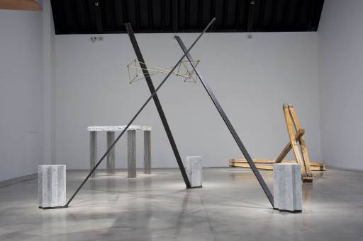 Tra le opere di Nagasawa che conosco, queste forse sono le più occidentali. La mia prima impressione ha associato loro le immagini geometriche del De divina proporzione di Luca Pacioli. Ma viene alla mente addirittura l’incerta geometria di Escher, o certe formulazioni elementari dell’astrattismo italiano. La prima opera, da destra (rispetto all’ingresso della sala), rilancia la riflessione sul dialogo tra orizzontale e verticale, tra statico e cinetico. La successiva è una specie di architettura impossibile, poiché delle sottilissime stecche di metallo sono incaricate di mantenere un consistente blocco di marmo. La terza articola un fiato geometrico per l’aria, con una specie di elica spaziale che gira su se stessa. L’ultima designa uno spazio votivo dove, nel suo complesso orientamento spaziale, comunque si trova un luogo per una coppia di delicatissimi vasi: una richiesta di silenzio e concentrazione nello strepito dello spazio divelto dalle altre opere.