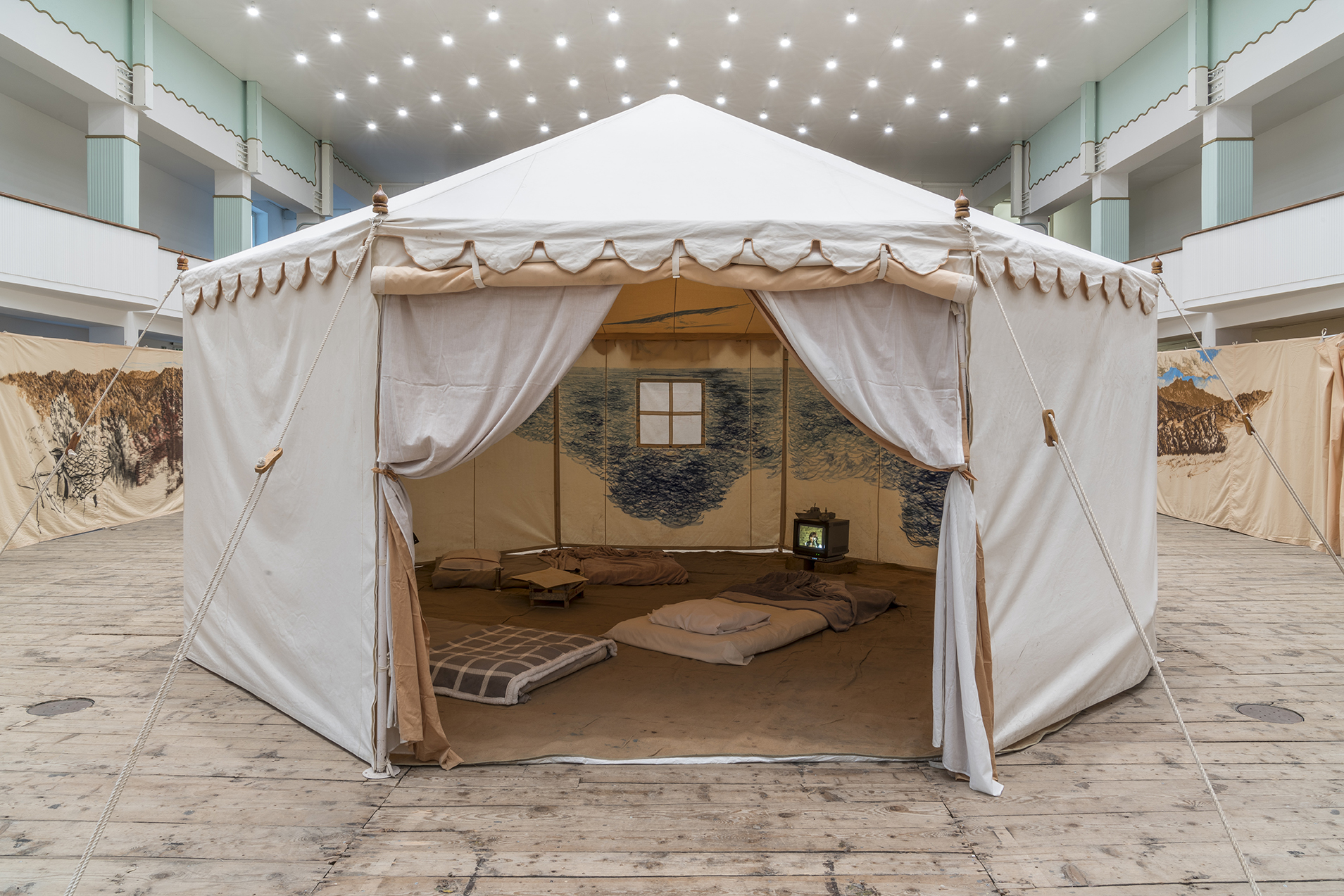La tenda, simbolo di nomadismo, nella platea della galleria Continua è la destinazione finale di un lungo viaggio?