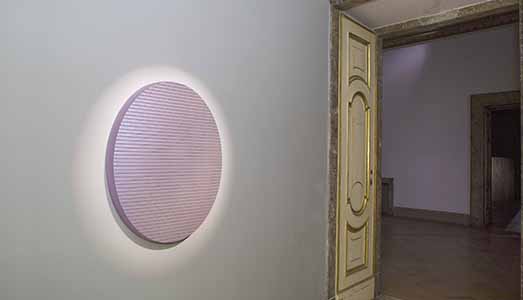 Ad accogliere i visitatori il colpo d’occhio delle tre opere illuminate come iridescenti. Esse non sono più composizioni fatte di nastri colorati e sovrapposti su supporto, cosiddette astrazioni modulari, secondo la tecnica ormai più conosciuta dell’artista, ma griglie ottenute dall’assenza del colore, come tracce di innumerevoli passaggi.