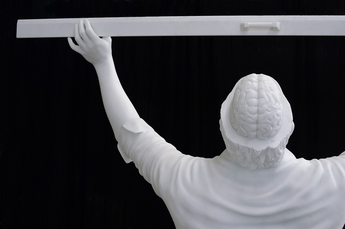 «Il volto è quello di mio fratello morto ma il corpo è il mio, in piedi su una piccola scala da biblioteca, le braccia tese con righello tra le mani, come se stessi cercando di misurare l’impossibile. Per me questa scultura è un omaggio alla vita e alla morte, all’anelito umano di andare oltre, di non arrendersi e continuare a tentare. È anche una metafora dell’essere artista, che cerca di progettare l’impossibile, continuando a pensare opere utopiche. In questa mostra alla galleria Mucciaccia presento L’uomo che misura il proprio pianeta, una nuova versione basata su quello stesso soggetto, a cui però ho aperto il cranio, per rendere evidente quella terra incognita che è il nostro cervello. Quest’opera è ancora un ricordo della morte di mio fratello, rappresenta l’assenza di limiti dell’immaginazione e le distese universali del tempo e dello spazio. La ricerca è infinita come è infinita l’immaginazione».