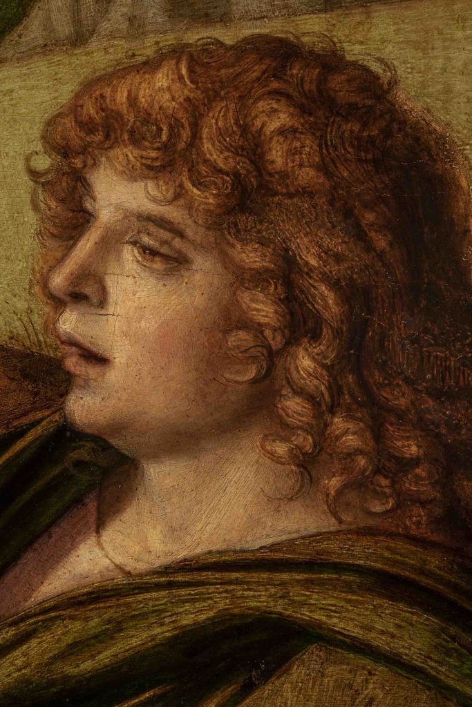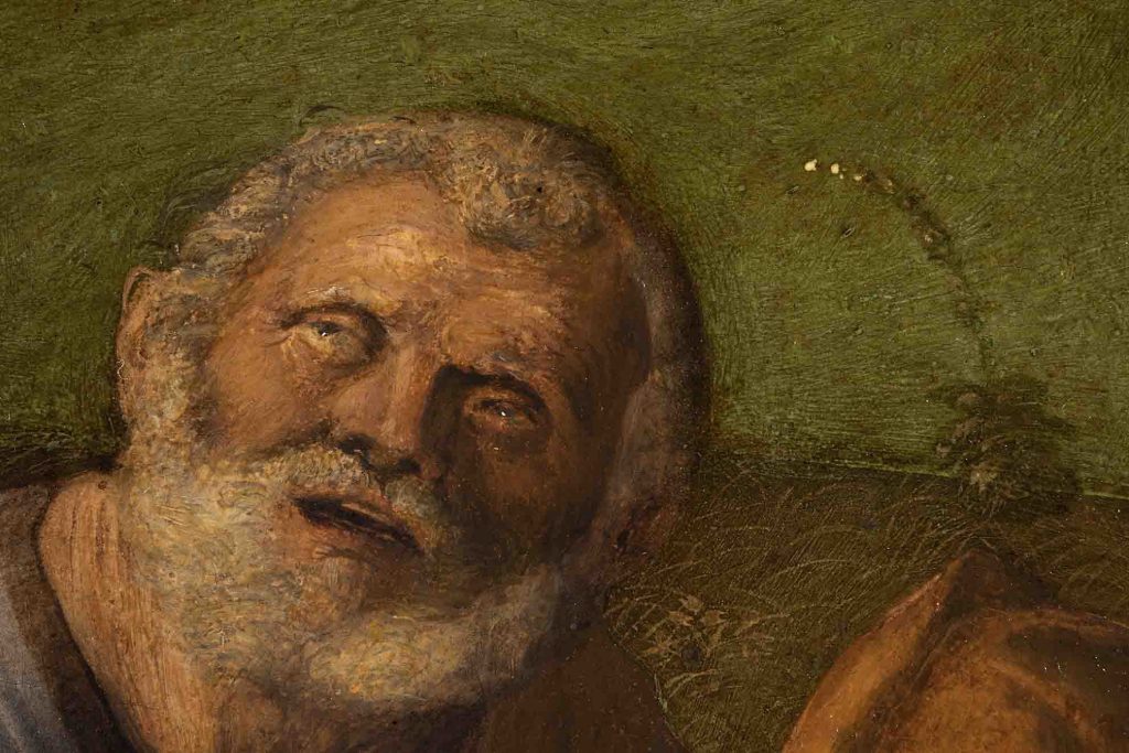 In effetti, le indagini diagnostiche attuali hanno chiarito come non esista alcuna vera e propria lacuna in corrispondenza delle teste, ma solo estese abrasioni superficiali su cui si evidenziano le ridipinture ottocentesche che interessano il volto dell’apostolo Pietro e coprivano parzialmente quello di Giacomo.
