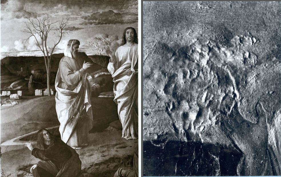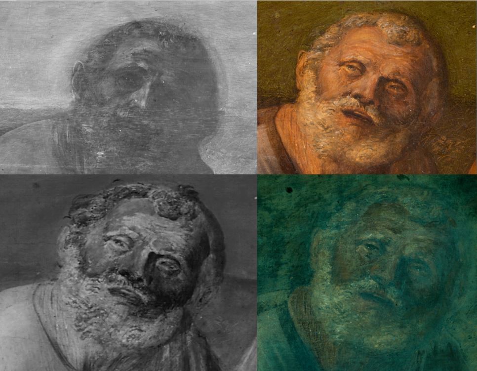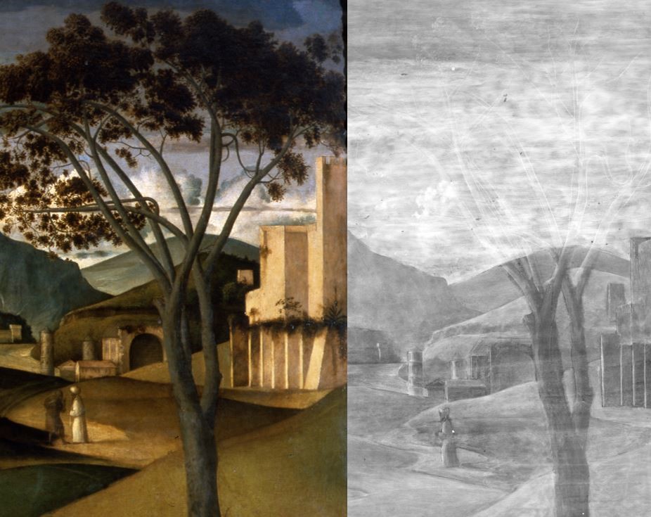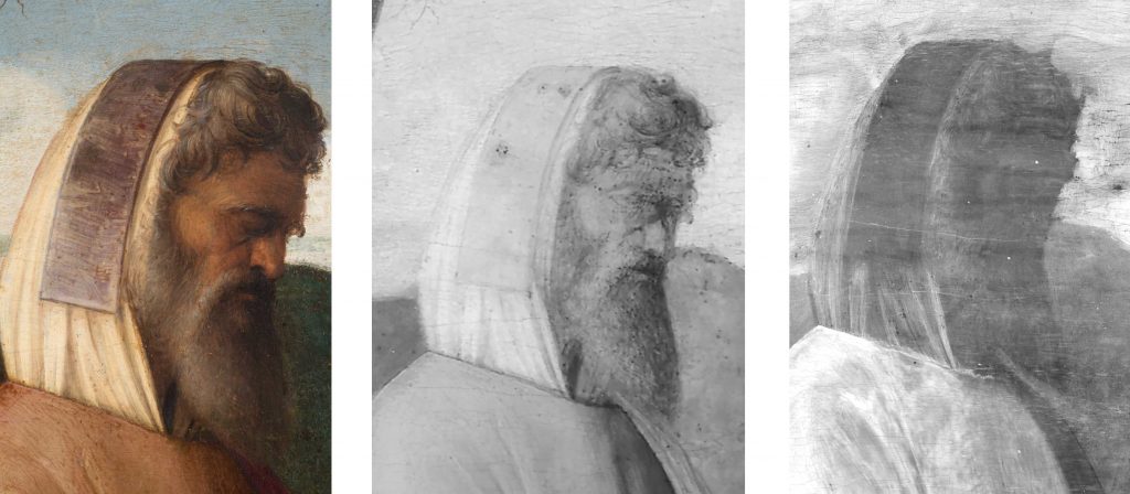 Infatti nell’esame radiografico, le figure, dipinte con stesure trasparenti, risaltano come sagome scure contro il tono chiaro dello sfondo e del cielo, eseguiti con materiali maggiormente radiopachi.