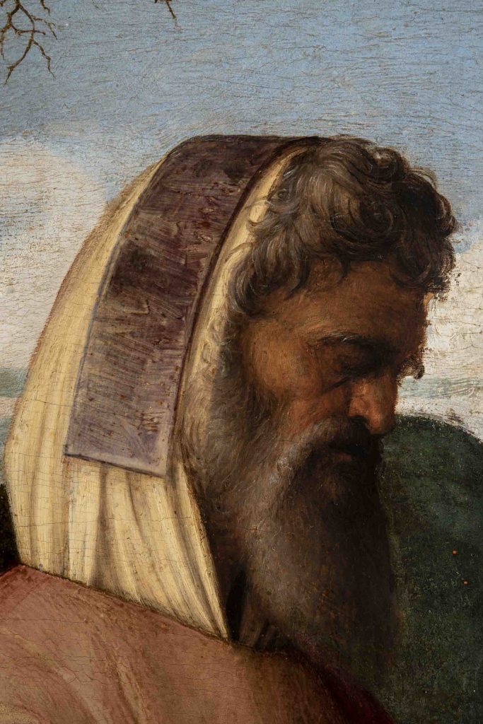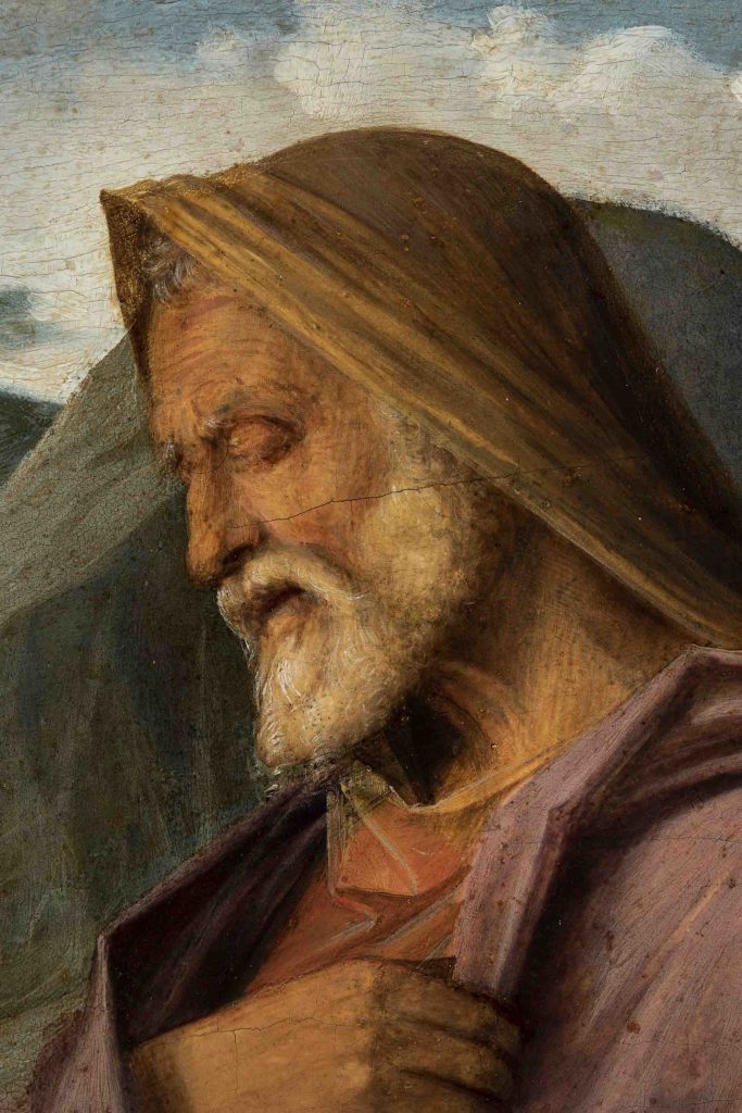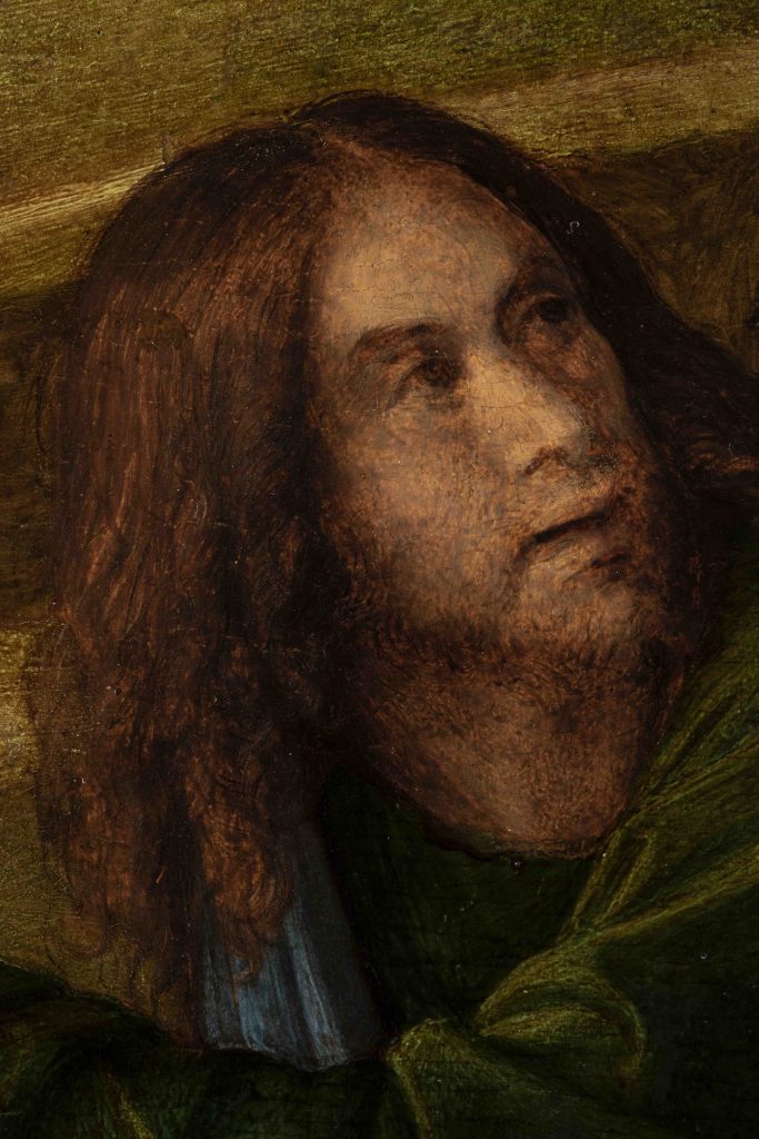 Questa prima fase della pulitura ha evidenziato alcune lacune di profondità – di cui la più importante interessa l’area adiacente la mano destra del Cristo e comprende parte delle dita – e notevoli abrasioni della superficie pittorica, impoverita in più punti negli strati superficiali, in particolare nelle aree del cielo e delle stesure verdi e brune che modulano il paesaggio, oggetto in passato di puliture drastiche e successive patinature di restauro.