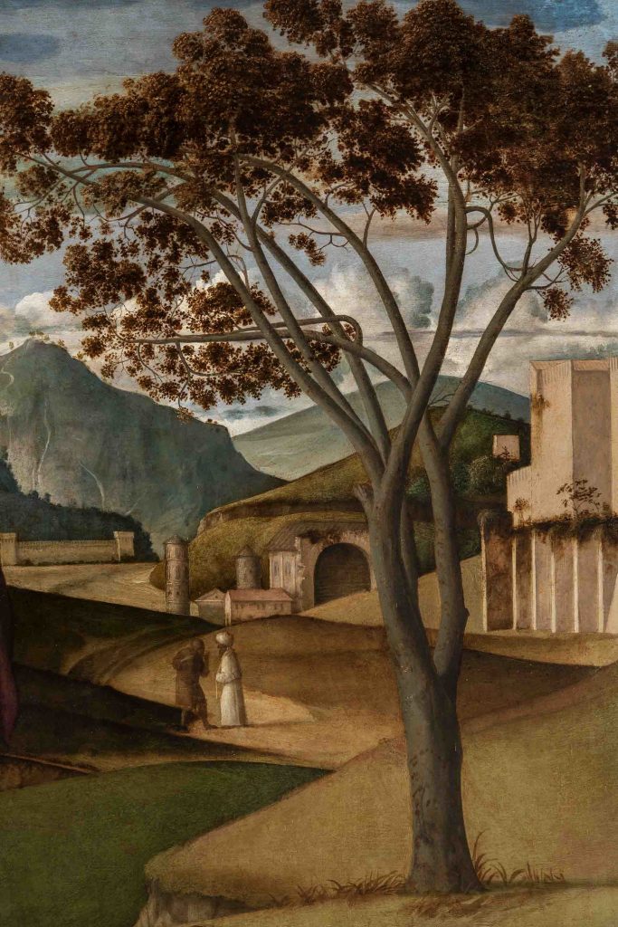 Gli strati di colore sono sottili e impalpabili, la loro leggerezza crea un effetto di luce interna dovuta al trasparire dello strato preparatorio chiaro: l’adesione di Bellini alla tecnica esecutiva ad olio sperimentata dagli artisti fiamminghi in questa fase della sua attività è pressoché totale, ma il pittore veneziano se ne appropria per destinarlo a un modo più sintetico e verosimile di raffigurare la natura, ad una luce e a uno spazio più razionali.