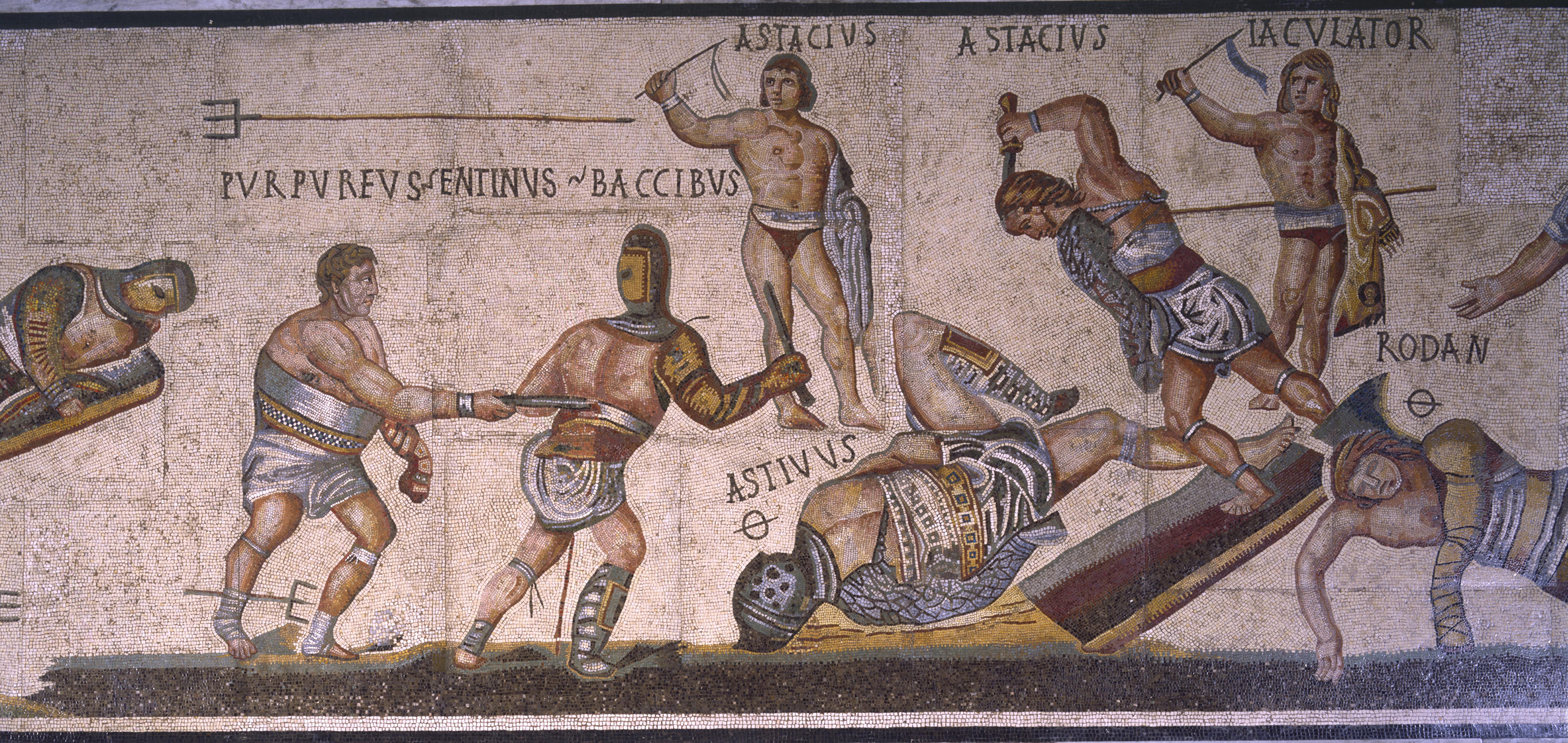 Osservando la scena, sembra quasi di sentire le schermaglie degli atleti, identificati dai nomi riportati di fianco. Purpureus, Baccibus, Astacius, Astivus sono rappresentati in diverse attitudini, gli uni vittoriosi, nell’atto di infliggere il colpo fatale, gli altri ormai prossimi alla morte. Traspirano sudore, coraggio, sofferenza.