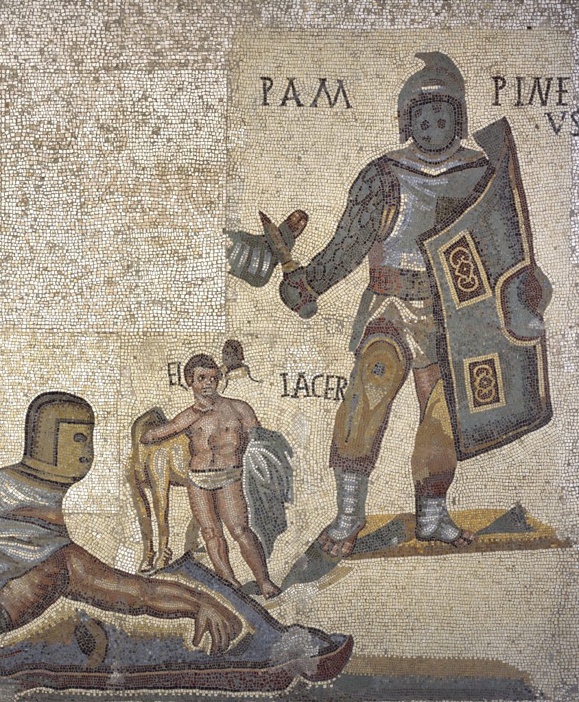 Ritrovato nel 1834 fra i resti di una villa di epoca imperiale sulla via consolare Casilina, il mosaico rappresenta un episodio dei munera, dal latino dono, regalo, ovvero i combattimenti gladiatori offerti dall’imperatore o dai senatori. Uno strumento di propaganda magnificente, panem et circenses appunto, con feste nazionali che potevano arrivare addirittura a superare i cento giorni.