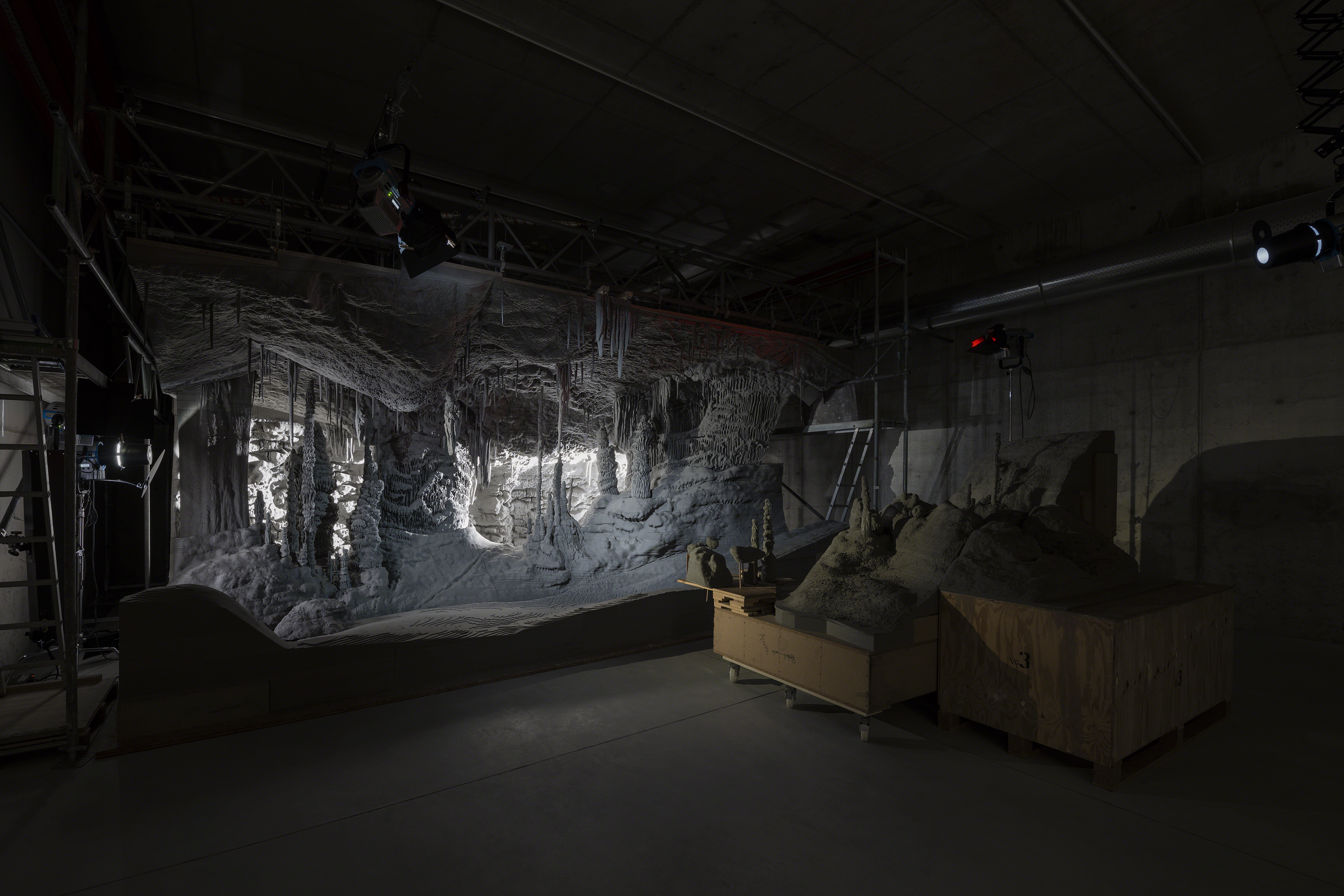 Uno degli elementi che caratterizzano Processo grottesco è il ricorso alla tecnologia di una macchina virtuale, con cui per la prima volta Demand si cimenta per tagliare, seguendo un modello 3D, i vari strati di cartone, utili per la ricostruzione tridimensionale. In questa installazione permanente, l’utilizzo di uno strumento ad alta tecnologia permette di imitare, con la sua decifrazione accelerata, le stratificazioni di una natura dal ritmo lentissimo. Il “processo grottesco” è animato da una contrapposizione che informa la rappresentazione della realtà da parte di Demand, che è ispirata a un luogo vero ma è rivelata come un luogo “irreale”, se non surreale, per le sue connotazioni sotterranee, misteriose ed inquietanti, esaltate in questa definitiva installazione nel piano interrato del Cinema della Fondazione.