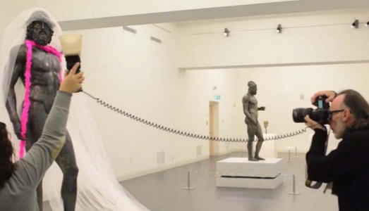 Qualche tempo fa nel centralissimo corso ha fatto capolino un baracchino preceduto di qualche metro da una grande scritta: “NO AI BRONZI ALL’EXPO. FIRMATE”, mentre artisti del posto cavalcano l’onda della polemica, gettando fuoco sul malcontento generale, sdoganando e poi normalizzando le foto di Gerald Bruneau, dove il kitsch diviene figlio dello stupor mundi e i bronzi vengono vestiti con boa di struzzo e slippini leopardati, tra trash e millantate operazioni dada (in verità ci si dovrebbe interrogare su quale scalpore possa creare un gesto obsoleto come il suo, che già aveva messo la sua firma sulla Paolina Bonaparte del Canova). Infine, per non farci mancare proprio nulla, in una calda mattinata settembrina un gruppo di giovani del circolo “Il Talebano”, capeggiati da un leghista di origine calabrese, si sono presentati al Museo inscenando un rapimento – simbolico – dei Bronzi per esprimere solidarietà a Vittorio Sgarbi.