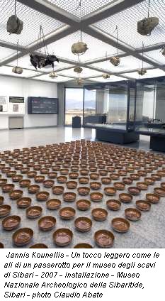 Davanti (o durante) quest’opera -veicolo spaziale e temporale- è ancora più evidente che la distinzione fra arte antica e contemporanea è del tutto fasulla e prende, invece, evidenza formale, corpo fisico, la frase ormai consueta che dice: tutta l’arte è contemporanea perché essa è tutta visibile a noi contemporaneamente, in questo luogo e in questo tempo, adesso, nello stesso momento in cui noi parliamo, guardiamo, ci muoviamo. Mentre noi facciamo tutto questo, l’opera d’arte si trasforma sotto i nostri sguardi, i nostri punti di vista differenti, le nostre parole, in un deposito di senso che muta di continuo, Kounellis ha messo in scena questo mutamento; l’opera di Cosenza è un deposito mobile dell’arte (di tutta l’arte) spinto a forza da un popolo che per un attimo si riconosce in questo gesto rendendolo legittimo, giusto e bello.