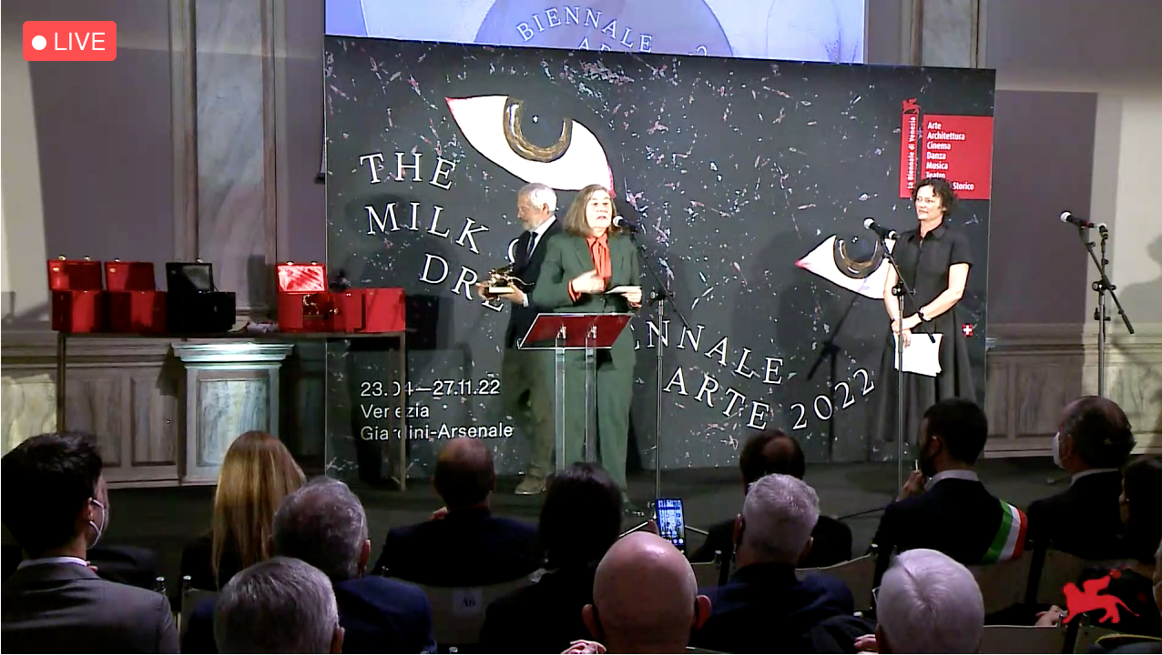 Subito dopo la Giuria ha assegnato le menzioni speciali a Shuvinai Ashoona e Lynn Hershman Leeson, al Padiglione Francia e al Padiglione Uganda, allestito a Palazzo Palumbo Fossati.