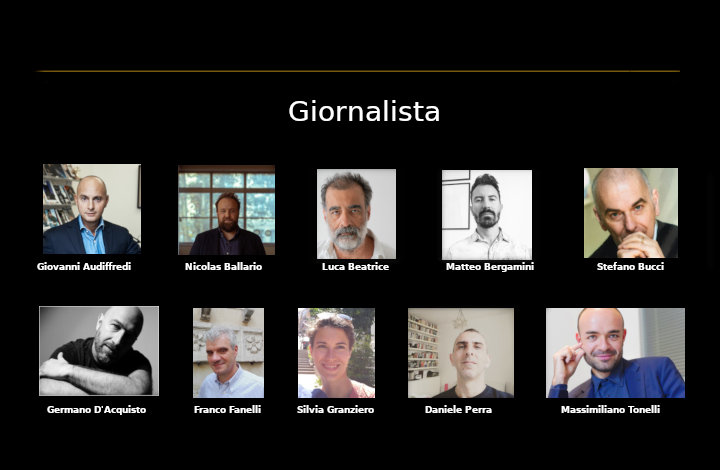 Per la categoria Giornalista, sarà premiato il migliore articolo di carattere divulgativo in ambito arte, cultura e innovazione digitale, scritto nel periodo 2020 e pubblicato su piattaforma digitale. I dieci giornalisti selezionati sono Giovanni Audiffredi, Nicolas Ballario, Luca Beatrice, Matteo Bergamini, Stefano Bucci, Germano D’Acquisto, Franco Fanelli, Silvia Granziero, Daniele Perra, Massimiliano Tonelli.