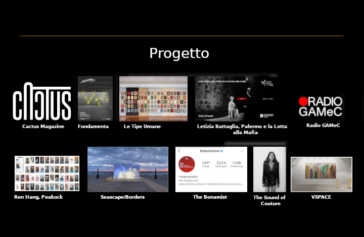 Infine, per la categoria Progetto, che premierà la migliore campagna o progetto digitale in ambito arte e cultura, i dieci finalisti individuati sono Cactus Magazine – Luca Smorgon e Simone Rossi, Fondamenta – Artissima; Le Tipe Umane – Andrea Incontri Tommaso Calabro; Letizia Battaglia, Palermo e la lotta alla Mafia – Istituto Italiano di Cultura di Berlino; Radio Gamec – Lorenzo Giusti e Leonardo Merlini; Ren Hang- il filtro, Centro per l’arte contemporanea Luigi Pecci; Seascape/ Borders Davide Quadrio; The Bonamist Francesco Bonami; The Sound of Couture #whatdoesistsoundlike – Valentina Nervi e VSPACE, Galleria Massimo De Carlo.