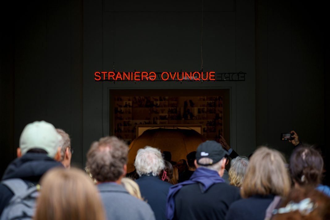 Introdotto da Cristiana Costanzo, il Presidente della Biennale Pietrangelo Buttafuoco apre la 60. Esposizione Internazionale d’Arte – Stranieri Ovunque – Foreigners Everywhere – affermando che «è un’avventura dell’anima, l’arte. E ciò che è dovuto a lei è un incamminarsi alla ricerca del chiarore, uno sperimentare continuo di tutte le nozioni che abbiamo dottato fino a oggi per dismetterle e ricominciare alla ricerca del chiarore. Abbiamo ricavato dal passato l’apologo della formica nera sulla roccia nera nella notte nera che sa di dover andar in cerca del chiarore. È una forma d’istinto che anche noi, noi tutti, condividiamo perché sappiamo che l’eternità è innamorata dei frutti del tempo». Gli fa eco il curatore Adriano Pedrosa: «È fantastico vedere tanti stranieri e italiani raccolti qui: la Biennale è un viaggio straordinario, spero sarà trasformativo per noi tutti, per gli artisti e per i visitatori».