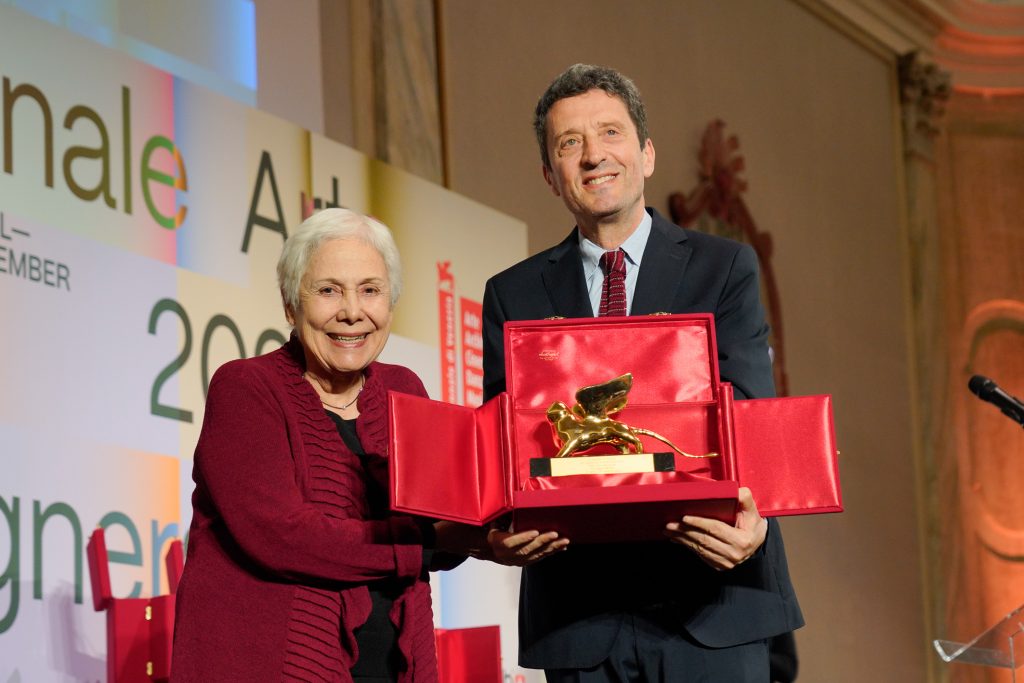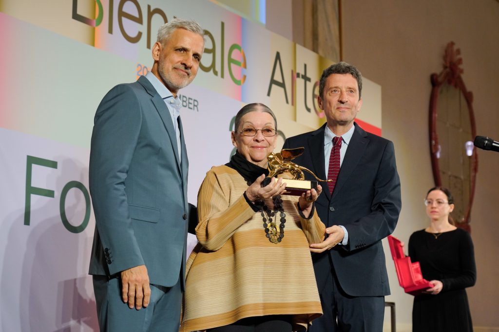 Due artiste straordinarie e pionieristiche, nonché migranti, che incarnano in molti modi lo spirito di Stranieri Ovunque – Foreigners Everywhere: Anna Maria Maiolino, emigrata dall’Italia al Sud America, prima in Venezuela e poi in Brasile, dove oggi vive, e Nil Yalter, turca, trasferitasi dal Cairo a Istanbul e infine a Parigi, dove risiede, ritirano il Leono d’Oro alla Carriera dedicandolo alla necessaria e urgente Pace nel mondo in un momento – dicono all’unisono – «in cui la pulsione di morte prevale sulla vita». Entrambe migranti, Maiolino è «felice di tornare in terra natia e ricevere il premio in una Biennale come questa, un atto politico metaforico e poetico che riunisce gli stranieri tutti», Yalter, altrettanto felice e riconoscente, mette l’accento sul bisogno assoluto di fare qualcosa affinché le cose possano cambiare.
