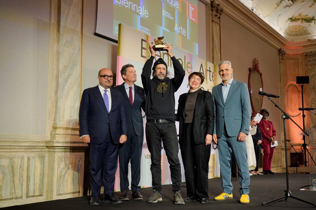 Chiude la cerimonia di premiazione Gennaro Sangiuliano , Ministro della Cultura, appellandosi alla passione, all’impegno, alla dedizione, alle difficoltà che gli artisti incontrano nel corso della loro carriera, all’immaginazione e alla fantasia. «Tempo fa ho detto che noi siamo chiamati a costruire il passato del futuro e oggi voglio ribadirlo perché credo che ogni epoca si testimoni grazie all’arte. É nostro dovere mettere a loro agio gli artisti affinché in piena libertà possano costruire quello che tra 200 anni sarà il nostro tempo. Adriano, voglio chiamarlo per nome, ha detto di aver potuto agire qui in piena libertà: ecco, ci impegneremo perché possa sempre essere così. Il viaggio di questa biennale accompagna alla radicale alterità di ognuno di noi, ma permangono concetti chiave come quelli di nazione, territorio, confine, identità e cittadinanza, a proposito del quale voglio lanciare un appello: che donne e uomini rimangano sempre cittadini in quanto destinatari di diritti e non debbano mai essere degradati a codici a barre».