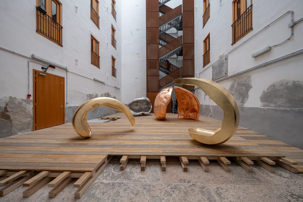 Piccola ma potente, l’installazione di Doruntina Kastrati – che dice commossa «sono felice di condividere parte della storia con le madri, come la mia che è qui oggi per esempio, con altre rappresentanze e con tante voci che dal margine arrivano ai nostri cuori» – fa riferimento al lavoro industriale femminilizzato e all’usura del corpo delle donne lavoratrici. Facendo riferimento sia ai gusci di noce utilizzati nelle delizie turche prodotte in fabbrica, sia alle parti mediche utilizzate per sostituire le ginocchia delle operaie logorate dalla produzione di questi dolciumi, le eleganti sculture di Kastrati invitano i corpi degli spettatori a interagire con loro. Un paesaggio sonoro vibrante viaggia attraverso il pavimento, risuonando sia nelle nostre ossa che in un’arena più ampia di attivismo femminista.