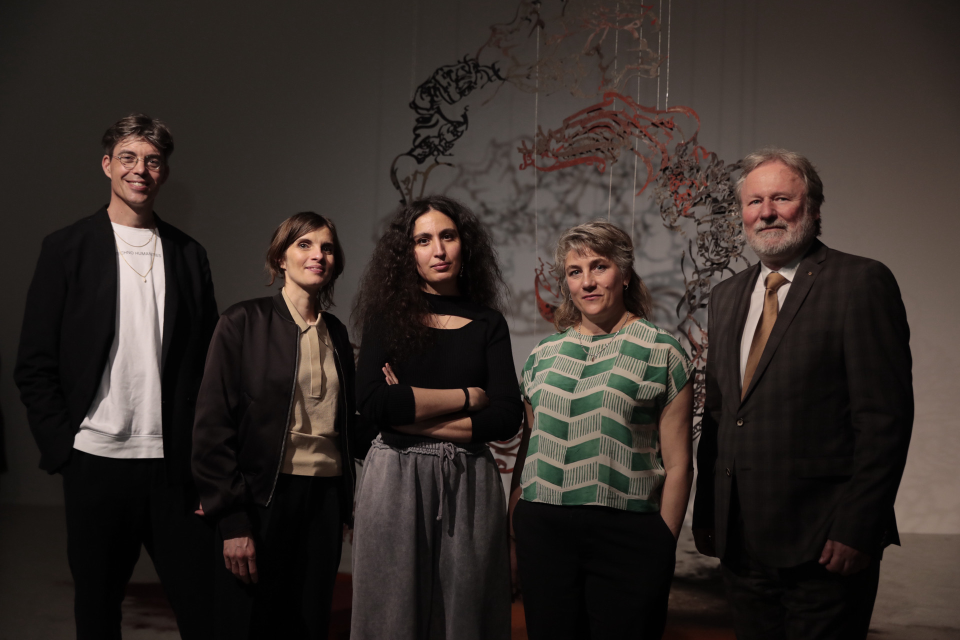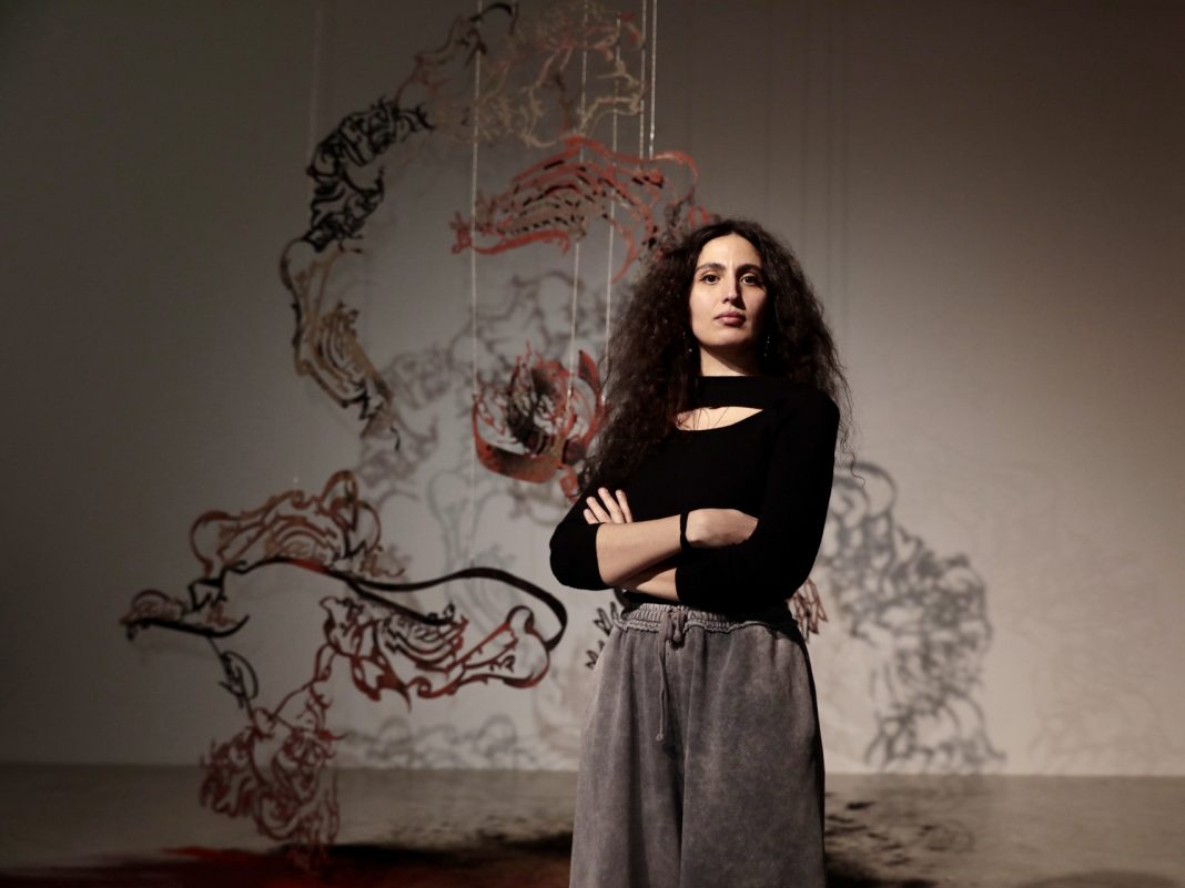 In mostra da Museion, le opere della serie Aniconism as Figuration Urgency (2021-), che le sono valse il VG Award. «Le opere di Monia Ben Hamouda sprigionano immediatamente un potere sensoriale», si legge nelle motivazioni della giuria, che ha evidenziato l’equilibrio compositivo con cui l’artista riesce a far interagire in modo coerente colori, forme, odori e luce. «Dal soffitto pendono ampie sculture in filigrana di ferro tagliato a laser. Mostrano caratteri calligrafici in stile arabo, tra i quali compaiono elementi figurativi come gufi e mani. Sotto di esse, un paesaggio gestuale di spezie si dispiega in colori intensi e terrosi che riempiono la stanza con il loro profumo. Allo stesso tempo, le ombre delle sculture in ferro appese riecheggiano sulla parete. È affascinante il modo in cui Monia Ben Hamouda onora la tradizione della calligrafia araba (il padre è un calligrafo islamico, ndr) nelle sue opere e allo stesso tempo dà forma all’urgenza dell’espressione figurativa, nonostante il divieto islamico di rappresentazione figurativa. Il tappeto di spezie, che sembra essere stato creato da gesti spontanei, così come le mani raffigurate nella scultura di ferro appesa, parlano di un atto di liberazione con cui l’artista trasferisce il suo patrimonio culturale nel qui ed ora», continua la giuria, che è rimasta colpita dalla natura «Accattivante e poetica» dell’installazione oltre che «Dalla sua profondità di contenuto, che racconta di un passato migratorio. Il modo in cui Monia Ben Hamouda traduce la complessa tematica in un gesto d’amore, che irradia contemporaneamente determinazione e forza, ci sembra indicare la strada di un dialogo interculturale condotto con apertura e rispetto reciproco».
