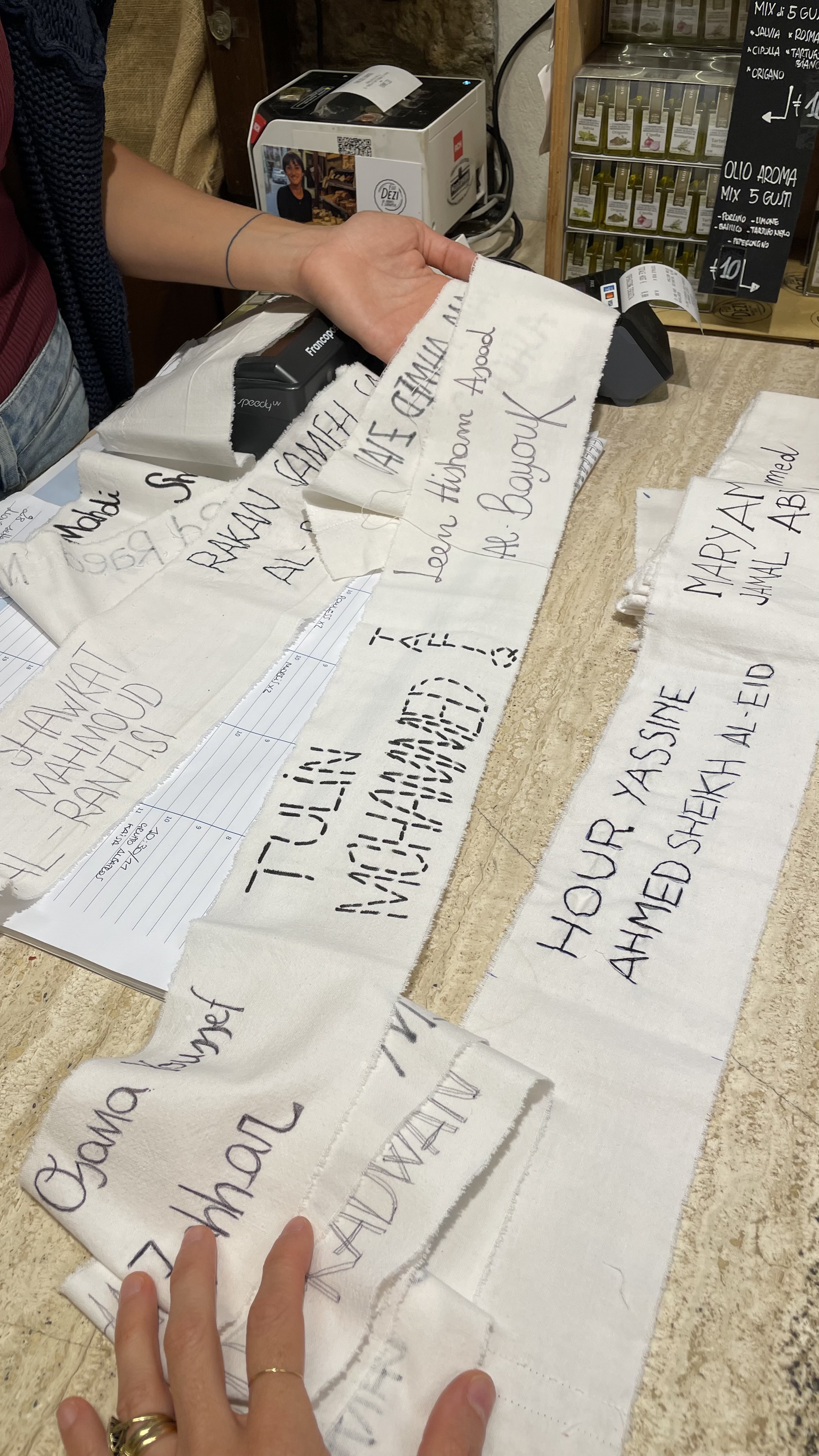 Dai primi giorni di settembre settembre, con la call Artisti tessili per Gaza lanciata su Instagram, centinaia di volontari, tra artisti, artigiani, associazioni, collettivi e semplici cittadini, hanno iniziato a scrivere, ricamare o dipingere i nomi delle giovani vittime su pannelli di stoffa bianca di 25×10 cm. Una volta uniti, questi frammenti comporranno un unico nastro che verrà srotolato in diverse piazze italiane prima di essere donato a un museo, una fondazione o a un futuro mausoleo, affinché diventi testimonianza permanente dell’orrore a cui stiamo assistendo.