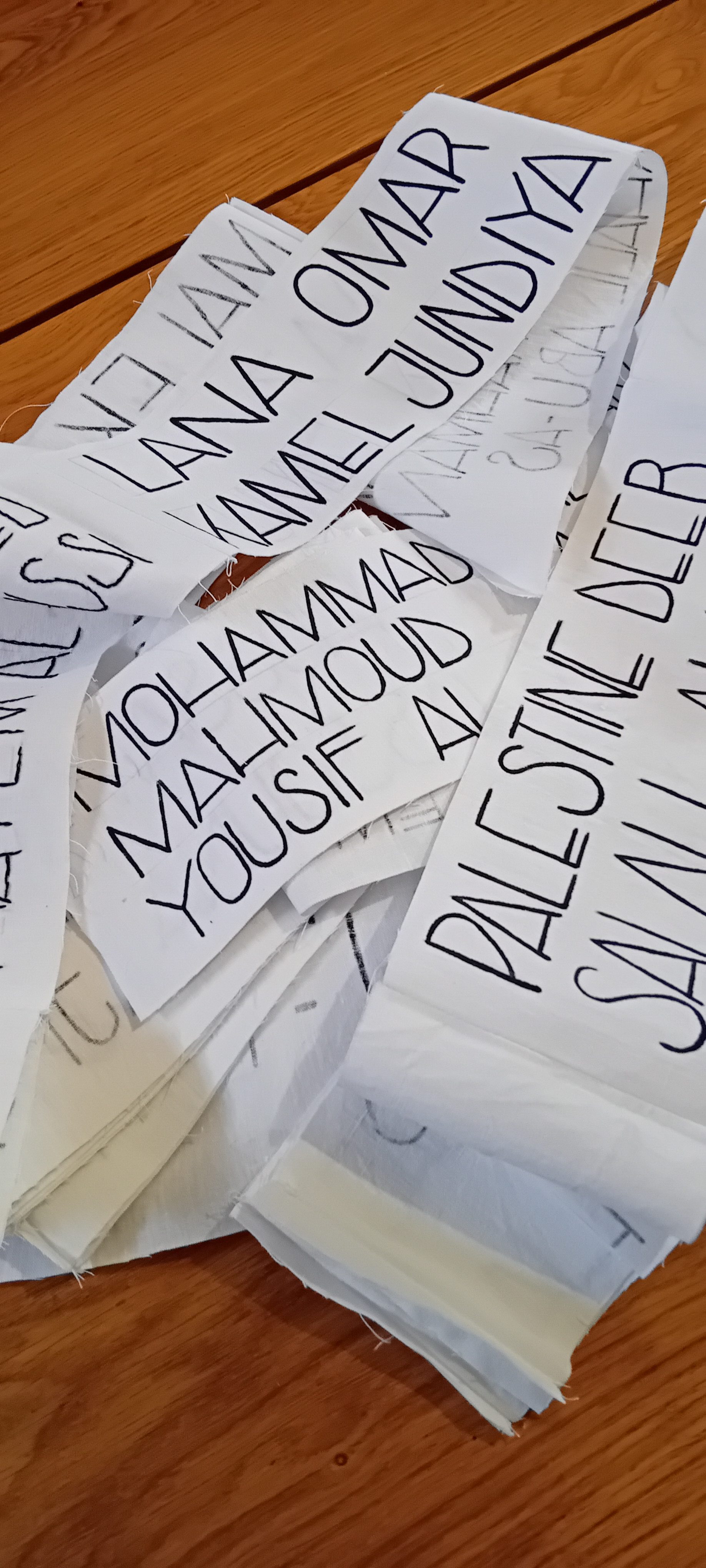 Il progetto si fonda sull’idea che ogni nome possa rappresentare una identità precisa, una storia individuale che acquista nuova forza attraverso le voci di altre persone. «Ogni nome è una vita che è stata spenta. Ogni nome che mi è stato affidato non si cancella più. Nel silenzio dei fili, i loro volti tornano a vivere: ogni punto ricamato è memoria, ogni nodo un grido che resiste al tempo», racconta Francesca Fusari da Firenze. Per altri, cucire è stato un modo di prendersi cura, come spiega Raffaella Zurlo da Pienza: «Continuo a cucire i nomi dei bambini di Gaza che sono stati uccisi. Non voglio che la stoffa si sporchi, me la tengo addosso, voglio coccolarli. I miei 50 bambini, appena nati e morti prima che compissero un anno. Sento che mi sto occupando di loro in qualche modo».