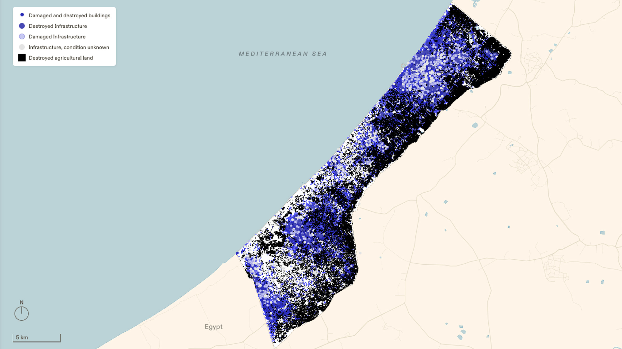 Riunendo dati provenienti da fonti quali UNICEF, OpenStreetMap, UNESCO, UNOSAT e Airwars per mappare la distruzione delle infrastrutture a Gaza, il gruppo ha scoperto che sono stati attaccati il 91% dei siti culturali, con 30 siti distrutti, l’82% degli edifici governativi, l’81% delle strutture universitarie, l’80% delle istituzioni religiose e il 75% delle scuole. La mappa interattiva è stata lanciata insieme a un rapporto intitolato A Spatial Analysis of the Israeli Military’s Conduct in Gaza since October 2023, in cui Forensic Architecture ha analizzato i dati raccolti sulla condotta militare israeliana a Gaza e i risultati dei modelli tratti dalle sue mappe.