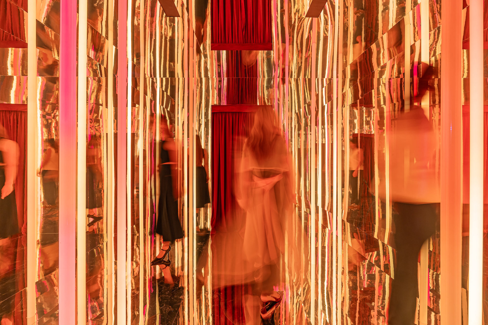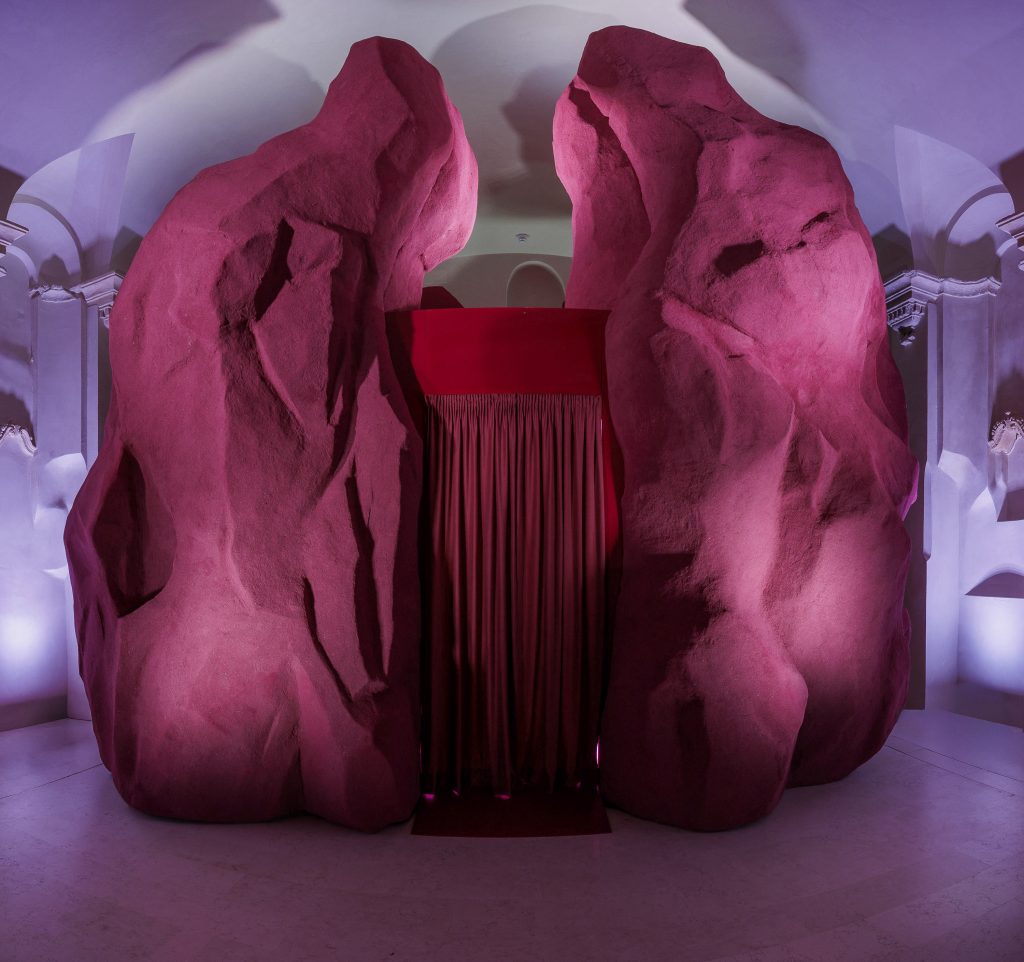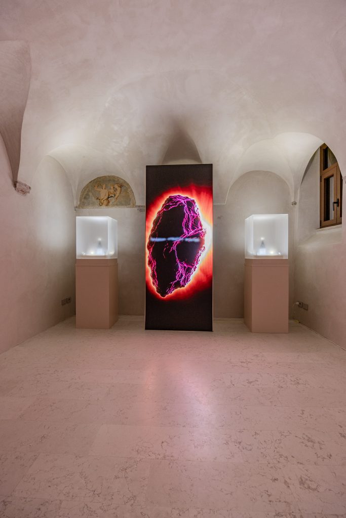 Immersa nel nuovo spazio appena restaurato del ‘Monastero’ di Palazzo Maffei, l’installazione si presenta come un monumentale geode fratturato, alto circa quattro metri e dalla tonalità vinaccia. La rottura diventa un gesto generativo: come l’acino che, nella spremitura, libera il proprio contenuto dando avvio al processo vinicolo, così il geode si apre rivelando un paesaggio interno fatto di luce, riflessi e suono. È nella frattura che si generano nuove prospettive. Attraversando questa scultura immersiva, il visitatore accede al secondo spazio del Monastero, entrando simbolicamente nel risultato di un incontro: quello tra Pasqua Vini e il winemaker americano Charles Smith. Un dialogo tra visioni diverse che trova la propria sintesi in una nuova etichetta, ancora celata all’interno di teche di vetro opache, che sarà presentata ufficialmente domenica 12 aprile. RESONANCE diventa così metafora della risonanza: una forza invisibile che nasce quando due identità si incontrano senza annullarsi, ma amplificandosi reciprocamente, dove la frattura non è più una separazione, bensì un punto di origine, capace di generare nuove progettualità e significati. Come racconta la stessa Ricciardi, «ho immaginato RESONANCE come un organismo vivo, capace di restituire visivamente e simbolicamente ciò che accade quando due identità entrano in relazione profonda. La roccia si apre, si lascia attraversare, e in quella spaccatura nasce qualcosa di inatteso e prezioso».