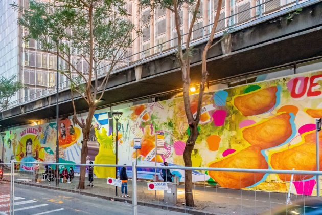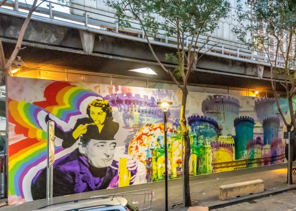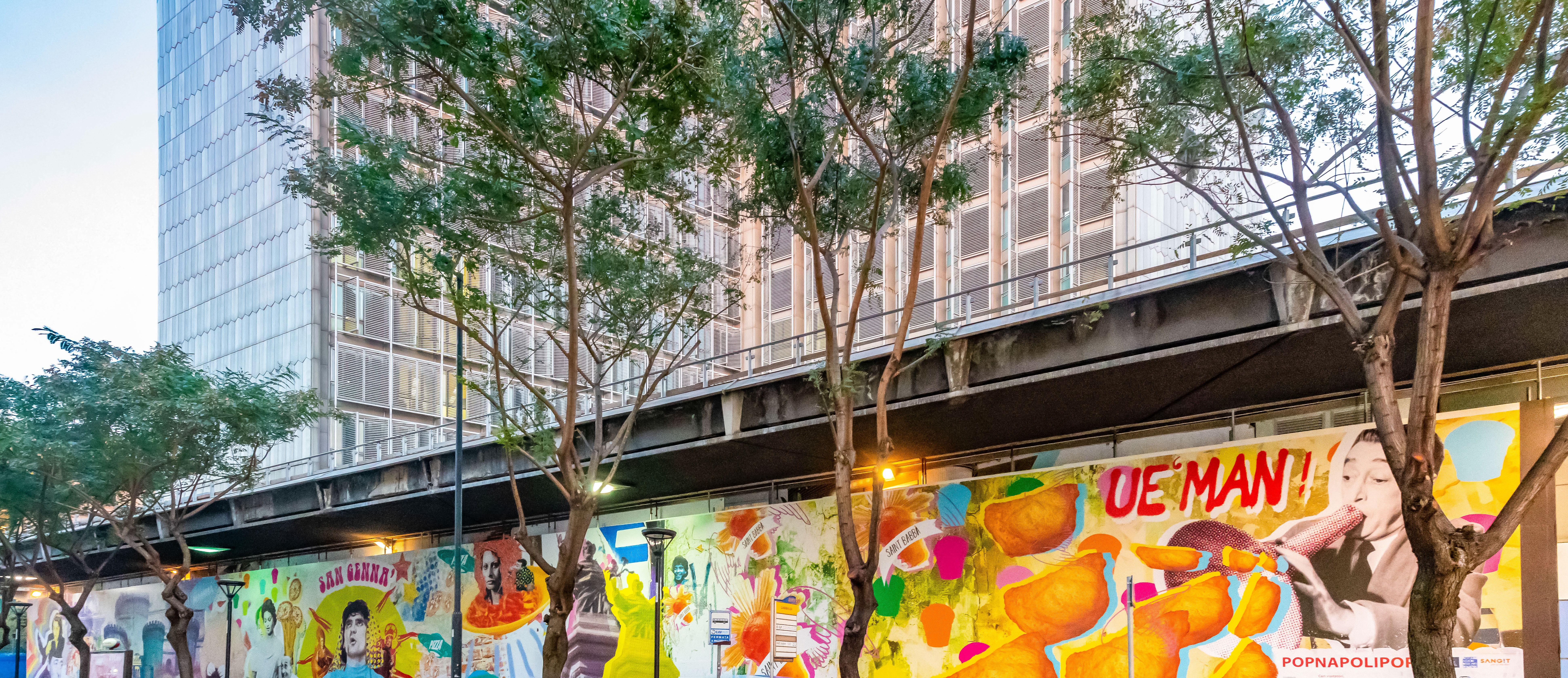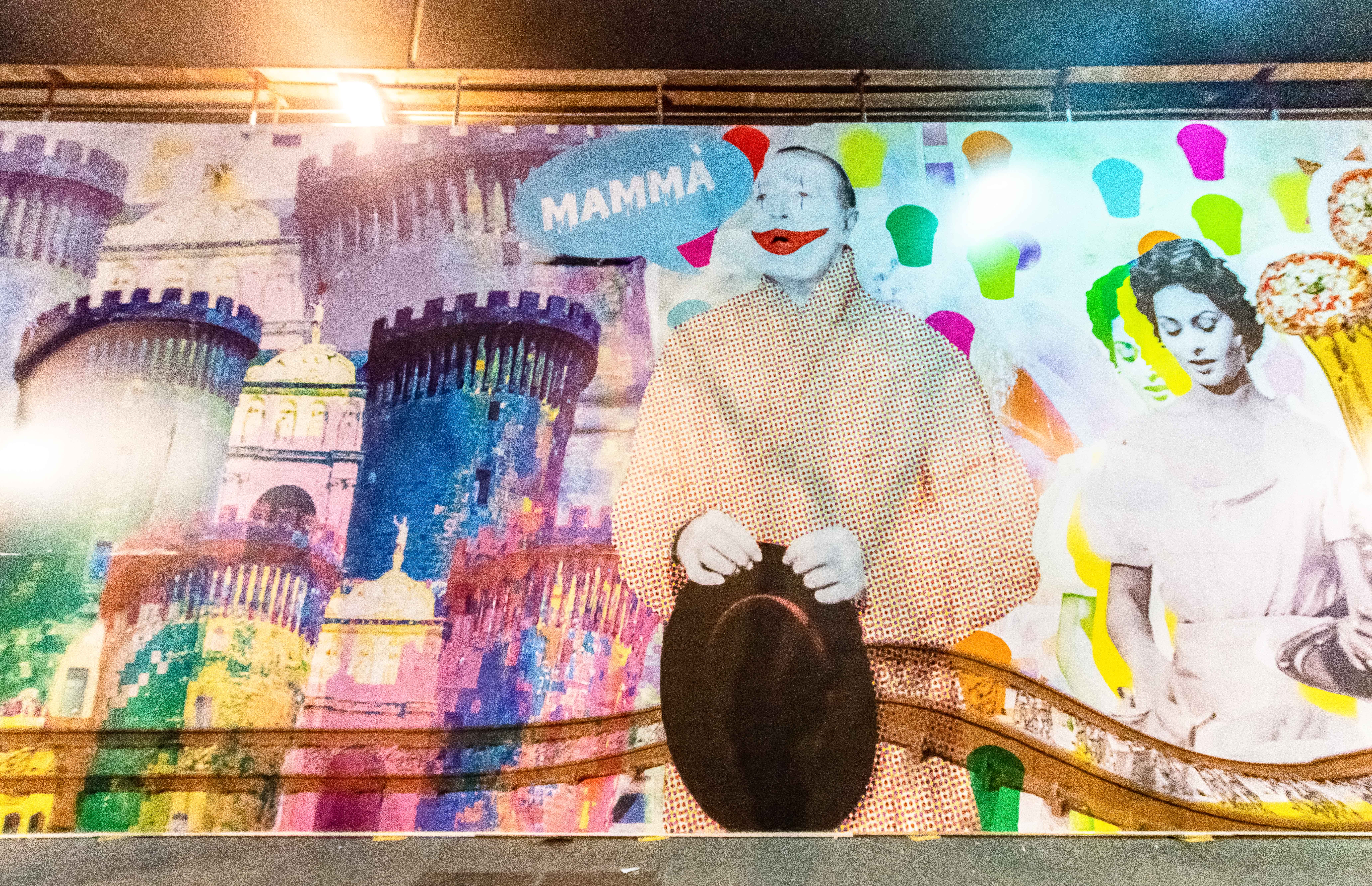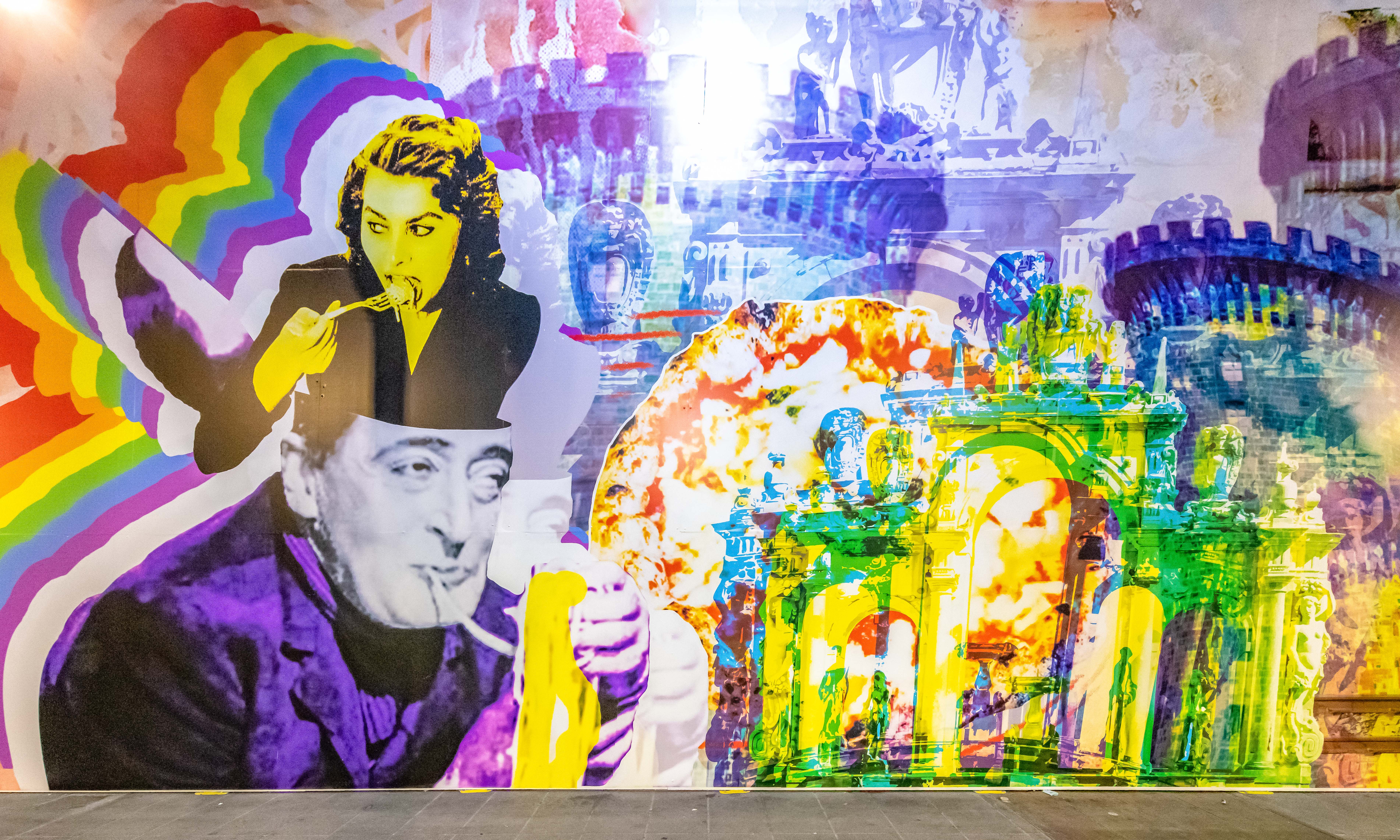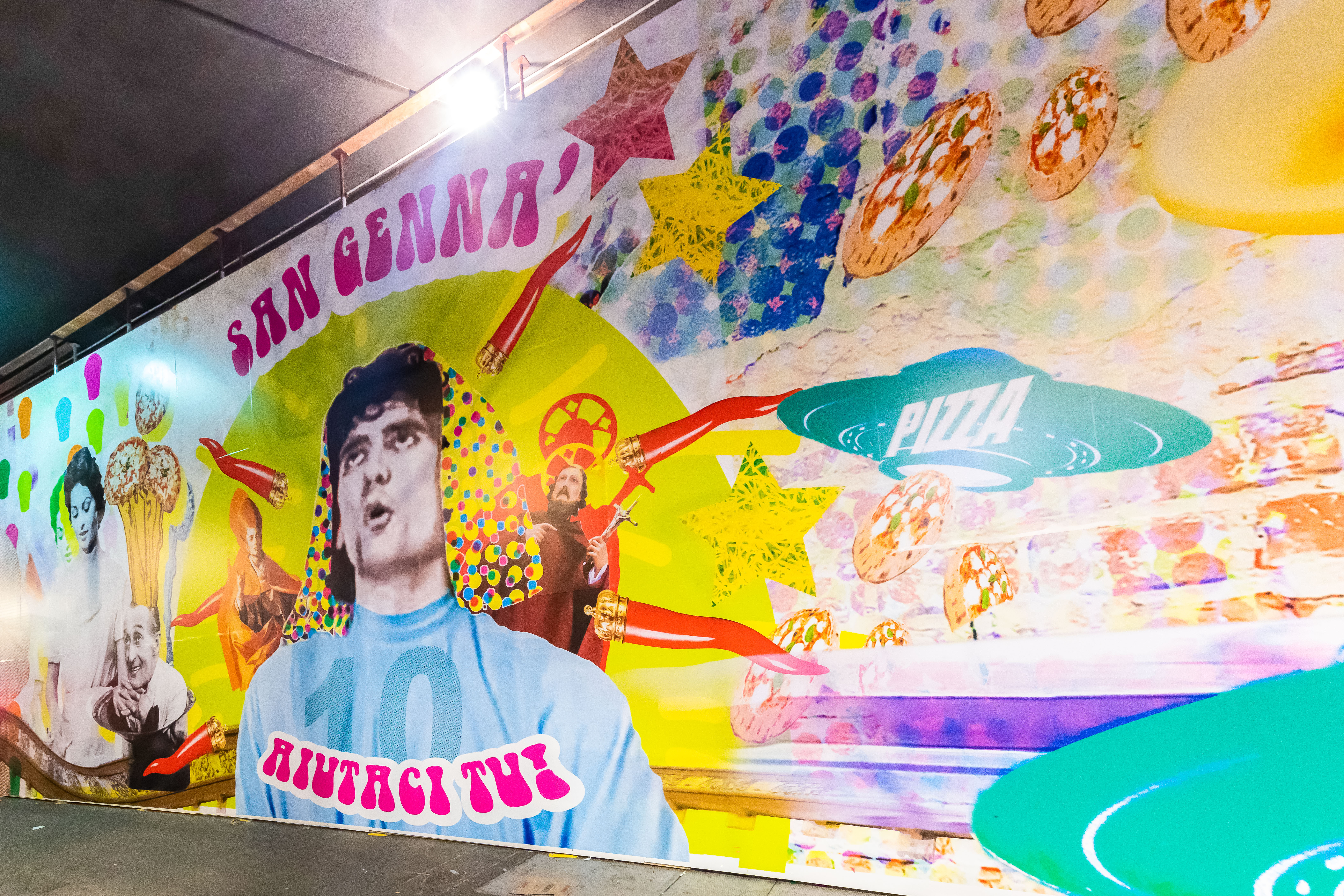 Tutto ciò prosegue a Napoli dove, su una delle facciate esterne della stazione Garibaldi, è stato realizzato un murales di grosse dimensioni, sul quale sono riprodotte le immagini più iconiche della cultura pop napoletana, personaggi che hanno un rapporto strettissimo con il territorio e che si intersecano con monumenti e prodotti gastronomici tradizionali. Un’iconografia che diventa un atto di celebrazione della città e del quartiere, un’opera che fa riferimento a linguaggi del Novecento come la pop art o al collage tipico del dada, ma che lascia trasparire una tipo di ricerca accademica totalmente originale.