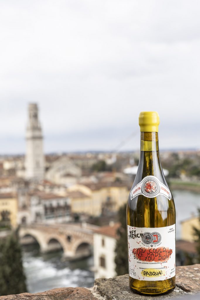 In questo contesto si inserisce anche la quinta edizione di Hey French: You Could Have Made This But You Didn’t, progetto che rappresenta una delle espressioni più evidenti della strategia della cantina, sia per la scelta del blend multivintage, tecnica ancora poco diffusa per vini fermi in Italia, sia per il posizionamento esplicitamente provocatorio, che richiama e sfida apertamente la tradizione francese. Come evidenzia Riccardo Pasqua, si tratta di «un passo ulteriore nel percorso di innovazione», in cui le diverse annate «dialogano tra loro, si completano e si rafforzano, dando vita a un’espressione unica e contemporanea». Importantissima in questo senso, la collaborazione con l’artista CB HOYO, autore dell’etichetta e di un intervento site specific installato sul Teatro Romano, pensato per entrare in relazione con il pubblico e per incentivare la partecipazione agli eventi teatrali attraverso un linguaggio visivo diretto.