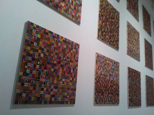 Beh, questa opera vale il viaggio. Imponente, colorata come solo gli arazzi di Boetti sanno essere, che apparentemente (e non solo apparentemente) racconta una e più storie, ma senza l’inutile irruenza di un gesto narrativamente espressionista. E più la guardi e più ci sprofondi dentro, tra quei colori e quegli innumerevoli segni. Senza però riuscire a capire quello che vi ha scritto il Sufi Berang, amico di Alighiero, che interviene sui fitti ricami realizzati dalle donne afgane. Lo stesso Sufi che sposò Boetti e la sua seconda moglie, Caterina, proprietaria della superba opera.