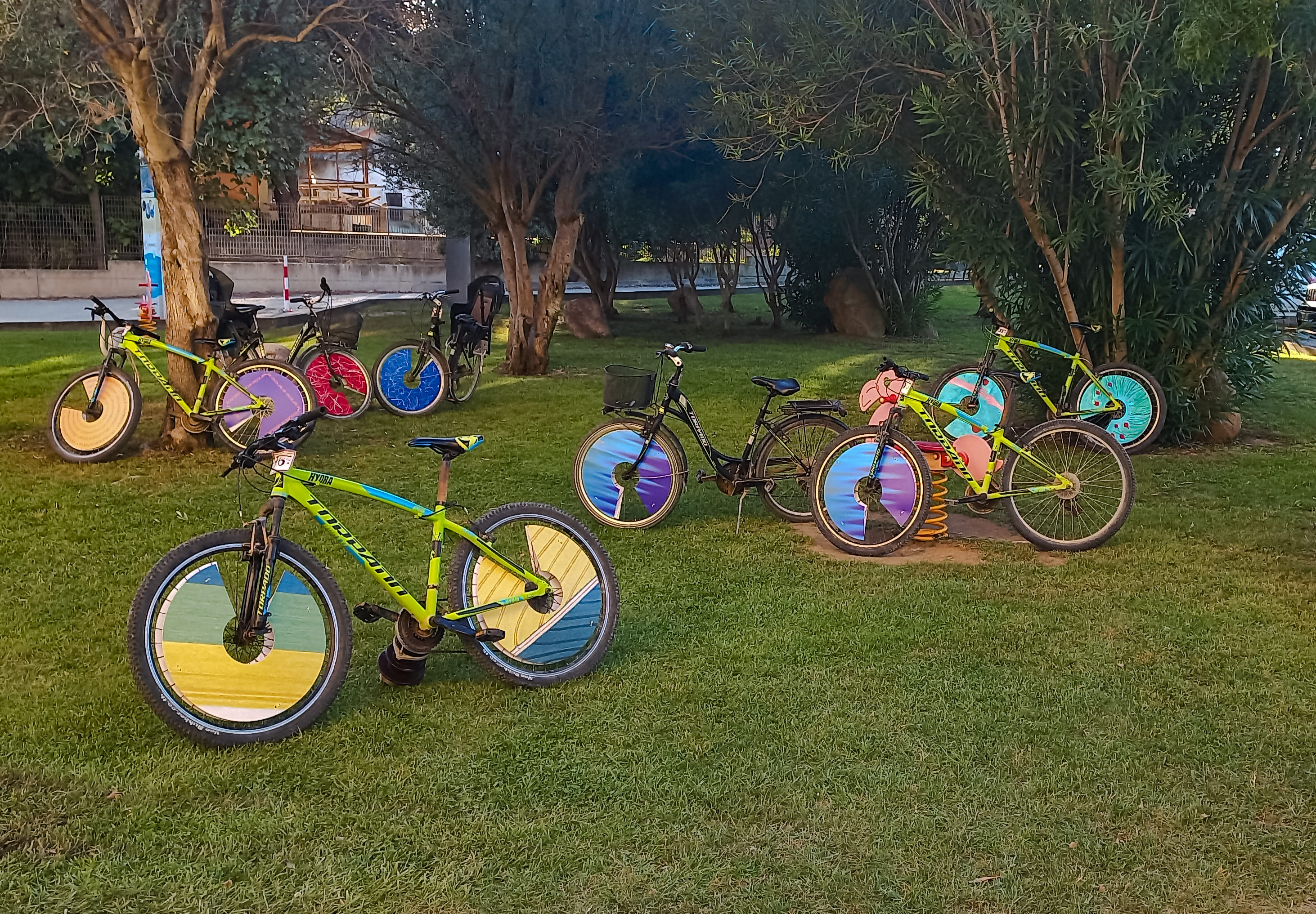 L’utilizzo delle ruote di biciclette e sedie a rotelle come sfondo per opere d’arte getta una nuova luce sull’importanza della ruota, non più vista come semplice mezzo di trasporto ma come veicolo della forza della fantasia. Da questa idea sono partiti Romeo Pinna, Paola Falconi, Enrica Badas, Francesca Sorrentino, Alberto Masala, Carlo Antonio Borghi & Aldo Tanchis, per Art Bike, una moltitudine di colori che girano come un caleidoscopio richiamando il ciclo vitale dei fiori, per celebrare la potenza silenziosa della natura.