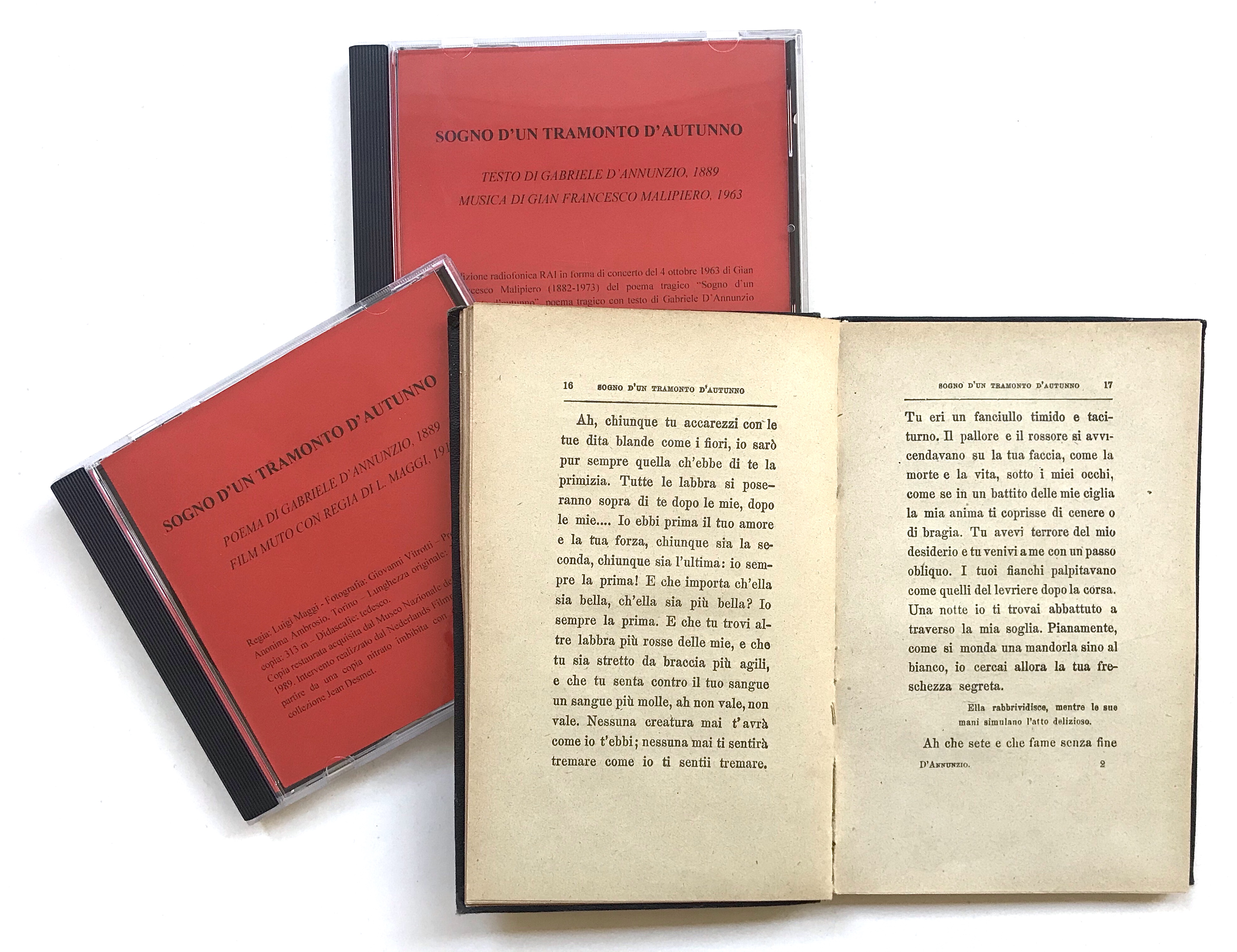 «Gli archivi si dividono in due gruppi: uno dedicato a Gabriele D’Annunzio e uno alla Musica Futurista. Il primo gruppo raccoglie alcune celebri pubblicazioni del più noto poeta del Decadentismo italiano – Canto Novo, Poema Paradisiaco, Sogno di tramonto d’Autunno – corredate dalle musichedi Franco Casavola, Francesco Paolo Tosti, Ottorino Respighi, Gian Francesco Malipiero e molti altri che si sono ispirati alle liriche del poeta.
