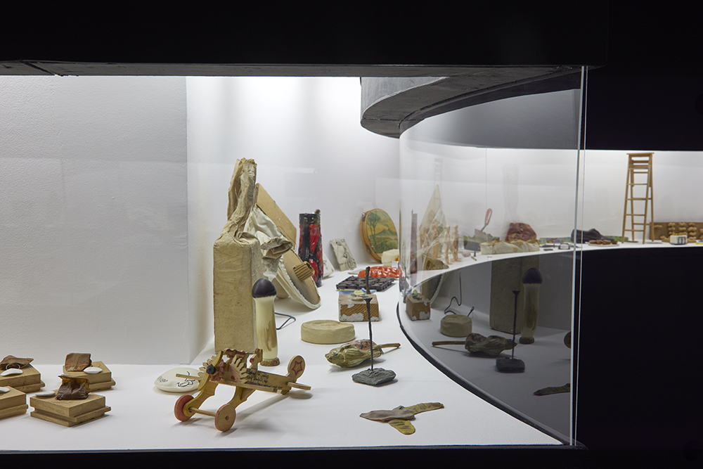 Prestato dal mumok di Vienna, il Mouse Museum di Oldenburg nasce da una raccolta di oggetti industriali e modellini delle sue stesse opere iniziata negli anni Sessanta. Nel 1972, in occasione di documenta 5, l’artista trasformò quella collezione in un museo a forma di Geometric Mouse, con centinaia di oggetti quotidiani esposti senza gerarchie. La fascia luminosa delle teche, che ricorda la pellicola cinematografica, guida lo spettatore in un flusso di analogie visive. Un (auto)ritratto ironico e critico dell’artista attraverso la lente della cultura consumistica.