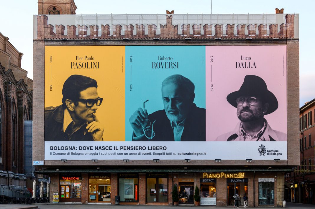 Il 5 marzo del 1922 nasce Pier Paolo Pasolini, poeta, scrittore, autore e regista che ha raccontato le trasformazioni di un Italia in cambiamento, che ha narrato le più nascoste pulsioni umane in opere d’arte che hanno segnato la cultura artistica e mediale del nostro paese. Figlio di un ufficiale di fanteria e di una maestra, la sua infanzia è a Bologna, come ha ricordato nell’incipit di “Poeti delle Ceneri”: «Sono nato nel 1922 in una città piena di portici», che lo omaggia con una gigantografia che vede la sua faccia affacciata su Piazza Maggiore, in compagnia di Roberto Roversi e Lucio Dalla di cui proprio il primo marzo ricorre il decennale della scomparsa.
