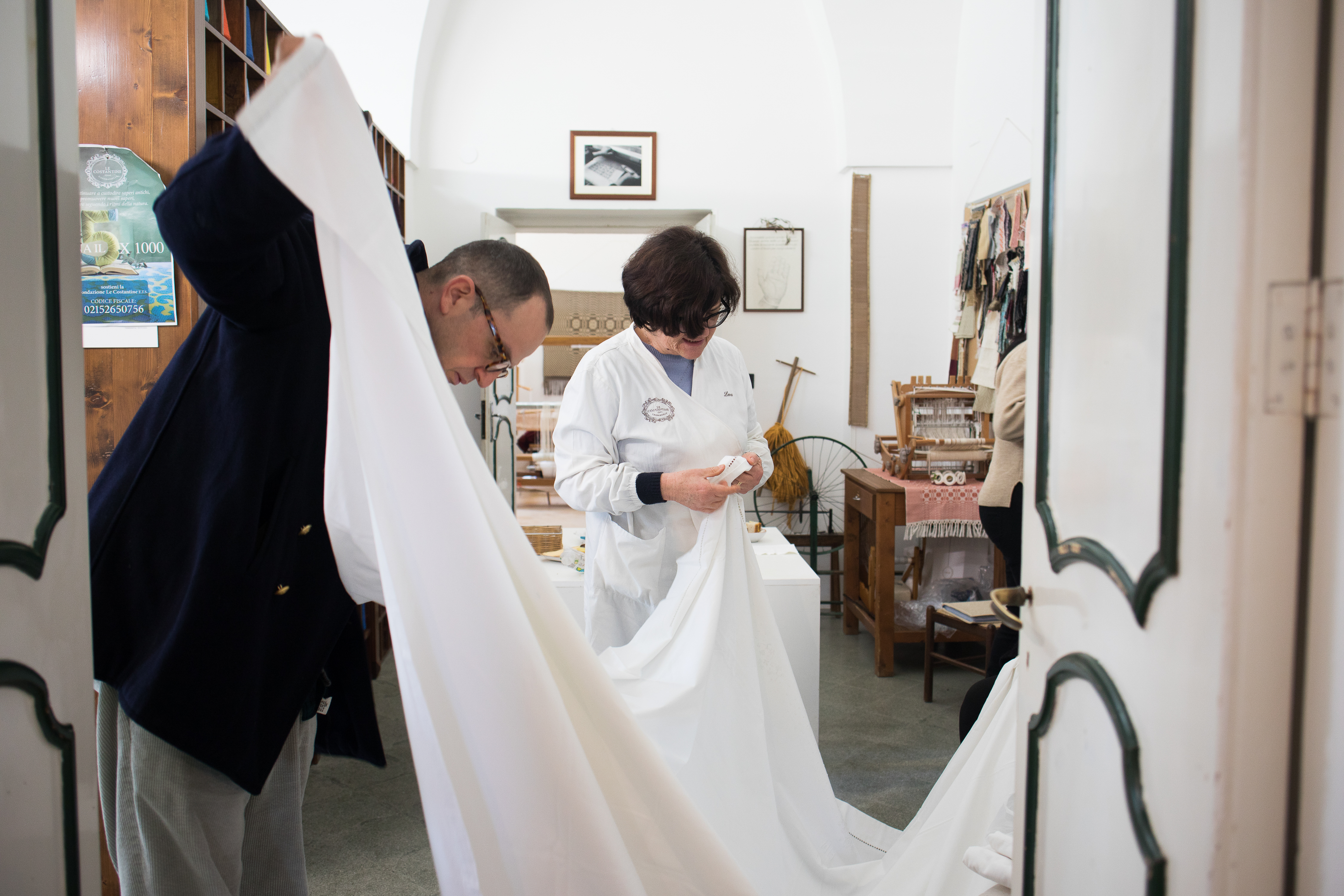 Giorni Felici è il titolo dell’installazione di Giuseppe De Mattia, pensata per l’Ecomuseo di Casamassella. Prende il nome da un ricamo su un asciugamano tessuto al telaio. Proprio gli asciugamani, insieme a tovagliette, federe e altri elementi tessili provenienti da vari corredi, compongono il corpus dell’opera. Sono stati acquistati da De Mattia tra il 2024 e il 2025. Grazie alla maestria delle tessitrici e sarte de Le Costantine, il bottino raccolto dall’artista è stato unito in un’unica grande tovaglia. Oltre a valorizzare la tradizione tessitoria, l’opera riunisce piccole storie familiari in un’unica narrazione, ora comica ora tragica, ma sempre autentica ed onesta.