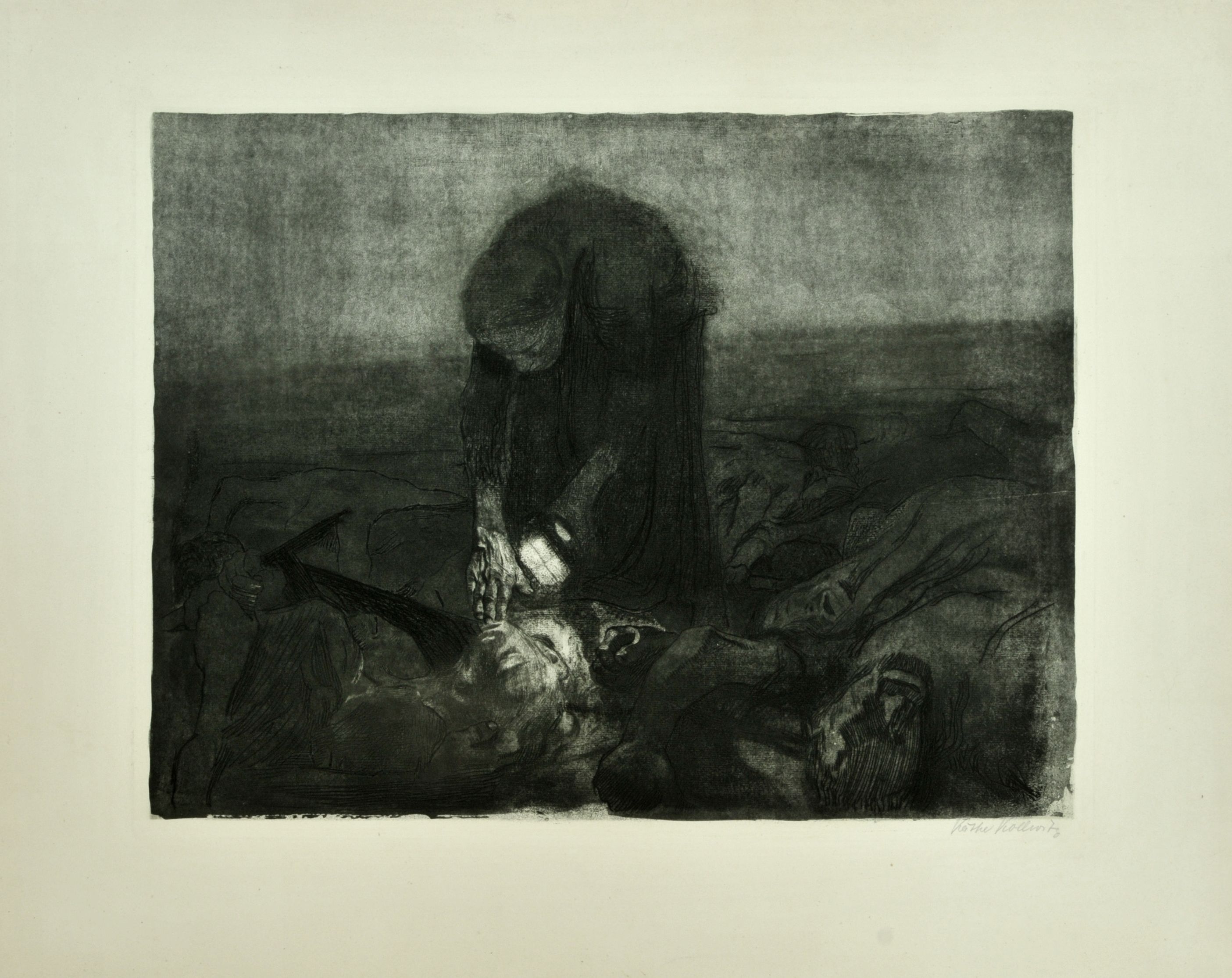 L’opera di Käthe Kollwitz, Schlachtfeld, racconta un’aspetto straziante della rivoluzione agricola durante la riforma protestante. Nell’apparente oscurità scorgiamo una storia terribile: una madre alla ricerca del corpo del figlio.