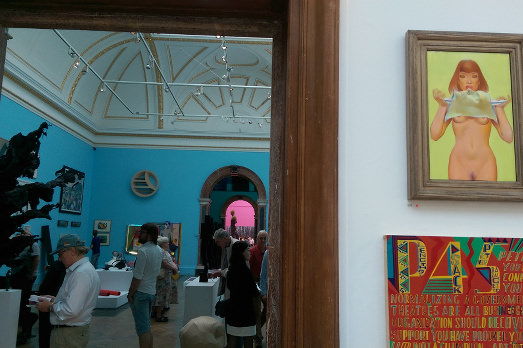 Entrando nelle sale si è subito colpiti dalla quantità abnorme di opere esposte – quest’anno 1131 – e dalla densità con cui occupano pareti e pavimenti: l’occhio vaga da un punto all’altro, ci si avvicina alle opere per sapere almeno il titolo, ma niente! Solo numeri, forse per garantire allo spettatore il diritto di poter guardare i lavori senza essere influenzato da nomi o altre informazioni. E anche bollini rossi. Già, perché le opere si possono acquistare, per finanziare l’unico istituto post-laurea gratuito nel Regno Unito, le Royal Academy Schools.