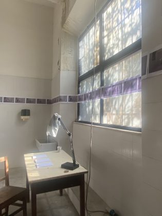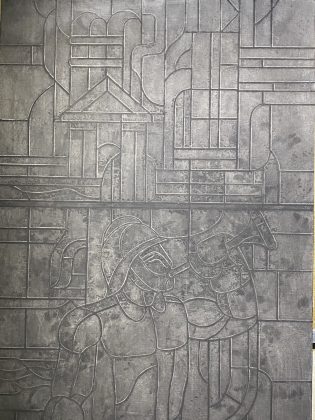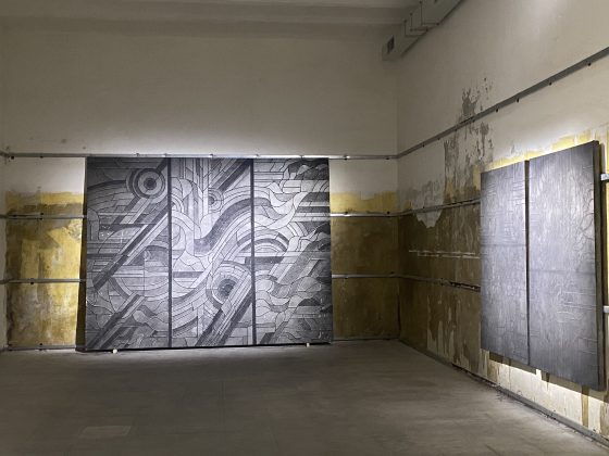 La mostra è chiusa dall’ultimo spazio in cui il progetto site-specific di Dariia Chechushkova si è sviluppato. Con Intermezzo l’artista racconta un lungo processo creativo testimoniato da uno splendido video posto al centro della stanza, che appassiona, scuote, commuove, anima l’ambiente che conserva le tracce ultime di un lungo lavoro sedimentato sugli smalti delle mattonelle bianche, nei disegni, nelle stampe. Un viaggio, una vita che si frantuma e si ricompone continuamente, si conserva, senza meta. C’è solo un sogno: che un giorno ci sia una casa ad attenderla nel suo Paese; radici e nomadismo forzato. Lei chiude e riassume tutto.