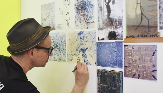 Sopra: Kristof Kintera, durante l’allestimento di Postnaturalia, 13-14 marzo 2017. Foto: Sofia Picariello