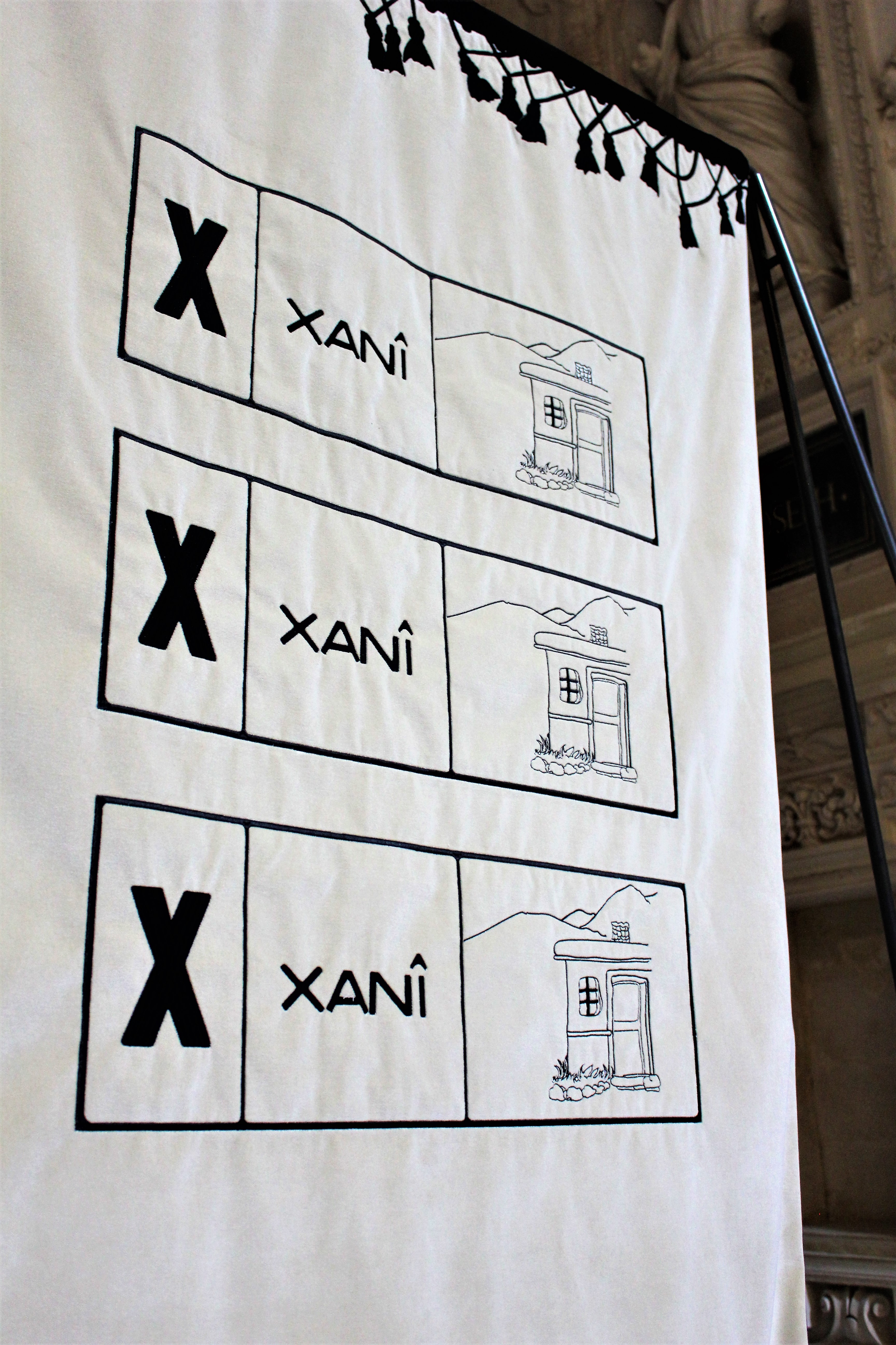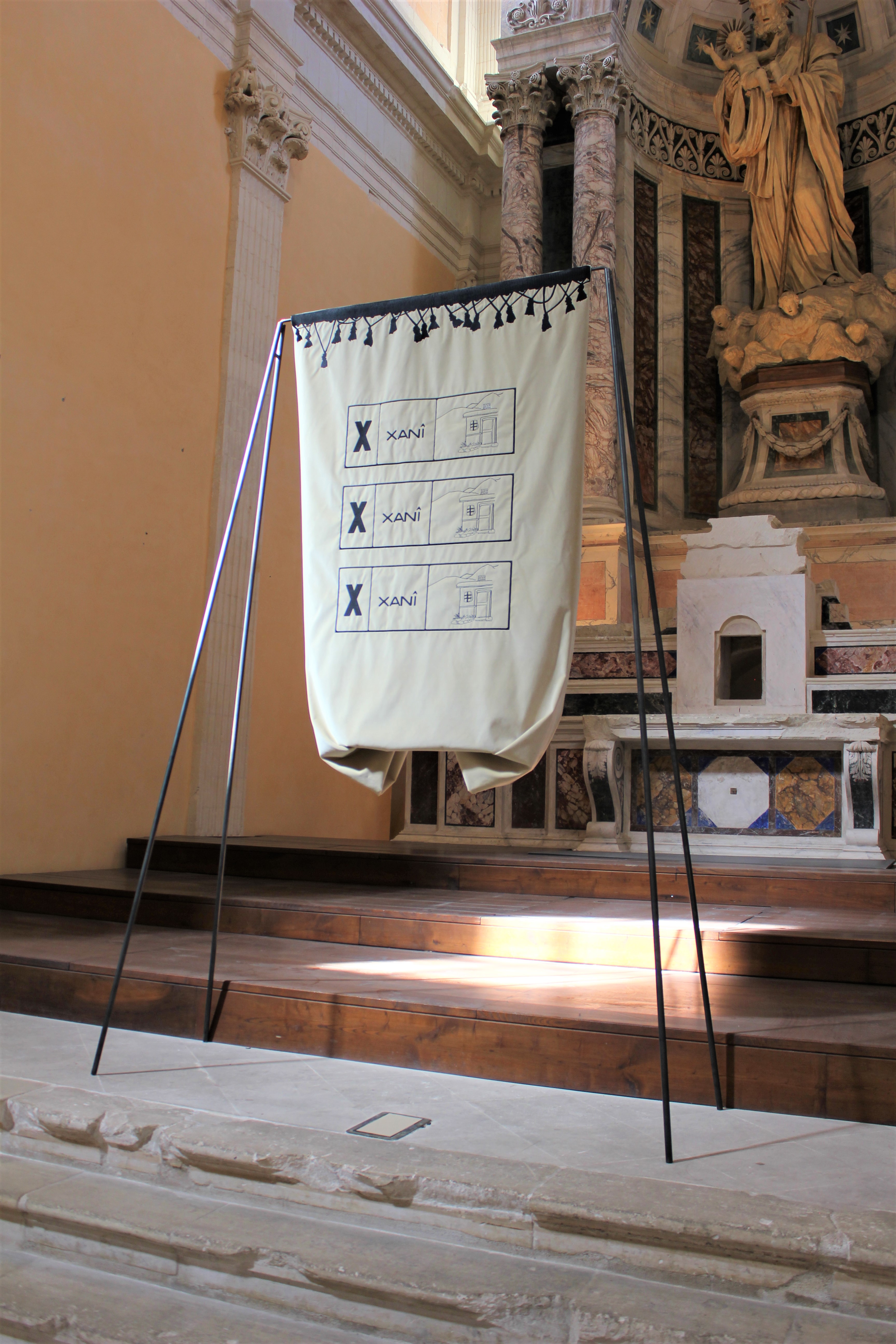 Oppure l’arazzo con la scritta Xanî – “casa” – (ricamata in caratteri curdi) nell’opera Xanî Xanî Xanî come vessillo di un concetto fondamentale (la casa ma anche il luogo in cui si nasce e si vive, la comunità), implicitamente politico e sociale, all’interno del fasto barocco e decorativo della chiesa di Lecce», continua Zaza.