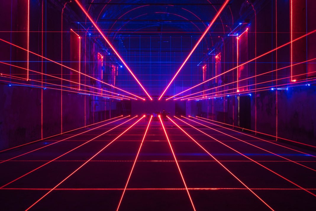 Attraverso l’installazione di 194 sorgenti laser con circuiti realizzati su misura, l’ambiente viene ridisegnato, esaltandone alcune caratteristiche e completandolo con elementi geometrici ed essenziali che rimandano a un livello superiore, intangibile, ma fortemente presente: quello virtuale.
