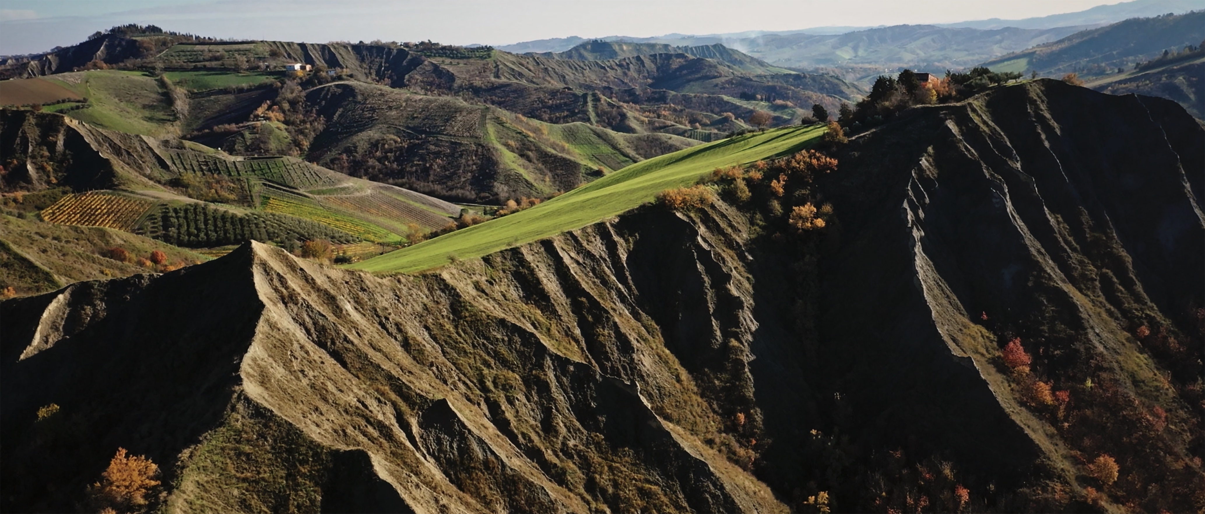 I calanchi sono i resti dei fondali sabbiosi del mare preistorico di milioni di anni fa che ora ospitano ginestre, orchidee e specie che crescono unicamente tra le loro particolari argille di colore azzurro, una materia che l’uomo ha poi saputo trasformare in ceramica, dando vita a un affascinante incontro tra natura e cultura. La particolare geografia del paesaggio è stata da sempre fonte di ispirazione per numerosi artisti che hanno contribuito a farla entrare all’interno dell’immaginario collettivo. Tra questi spicca Carlo Zauli, uno dei più importanti ceramisti scultori del Novecento, che dedicò gran parte del suo lavoro a queste terre, raffigurandole nelle sue monumentali sculture.