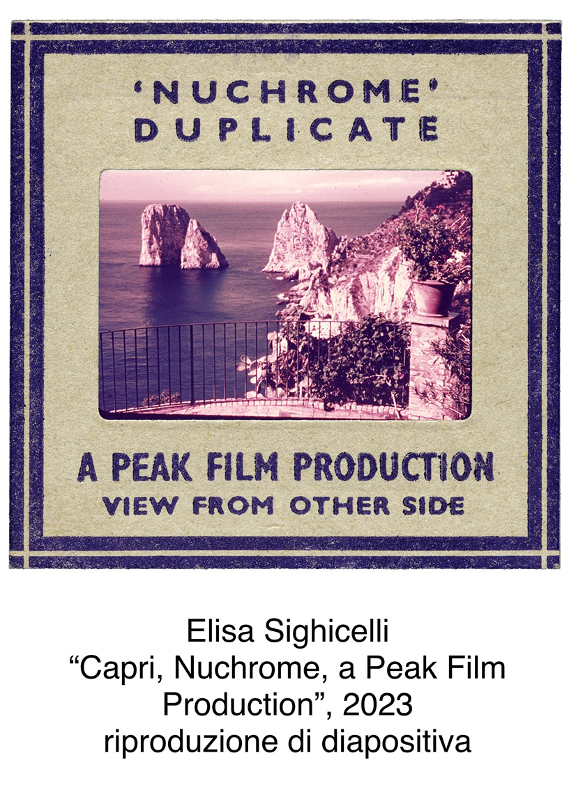 Elisa Sighicelli è la protagonista della terza edizione del progetto d’arte pubblica Manifesto che ogni anno prevede la realizzazione di un’opera da esporre in una serie di spazi nel centro storico di Anacapri abitualmente destinati alla comunicazione istituzionale e commerciale. Dopo il progetto di Patrick Tuttofuoco nel 2021 e quello di Anna Franceschini nel 2022, l’artista e fotografa torinese ha presentato Caprimania, al termine di un periodo di residenza artistica sull’isola tra fine marzo e inizio aprile, durante il quale ha lavorato su un repertorio di diapositive degli anni ’50, ’60 e ’70 del secolo scorso, scattate da anonimi turisti nel corso dei propri fugaci soggiorni sull’Isola azzurra. Le opere di Sighicelli, nella forma ingigantita del manifesto, comprendono tanto la riproduzione delle antiche immagini quanto il format delle diapositive, su cui trascritti compaiono i dati tecnici di produzione della pellicola o, talvolta, l’annotazione di dettagli personali degli antichi autori.
