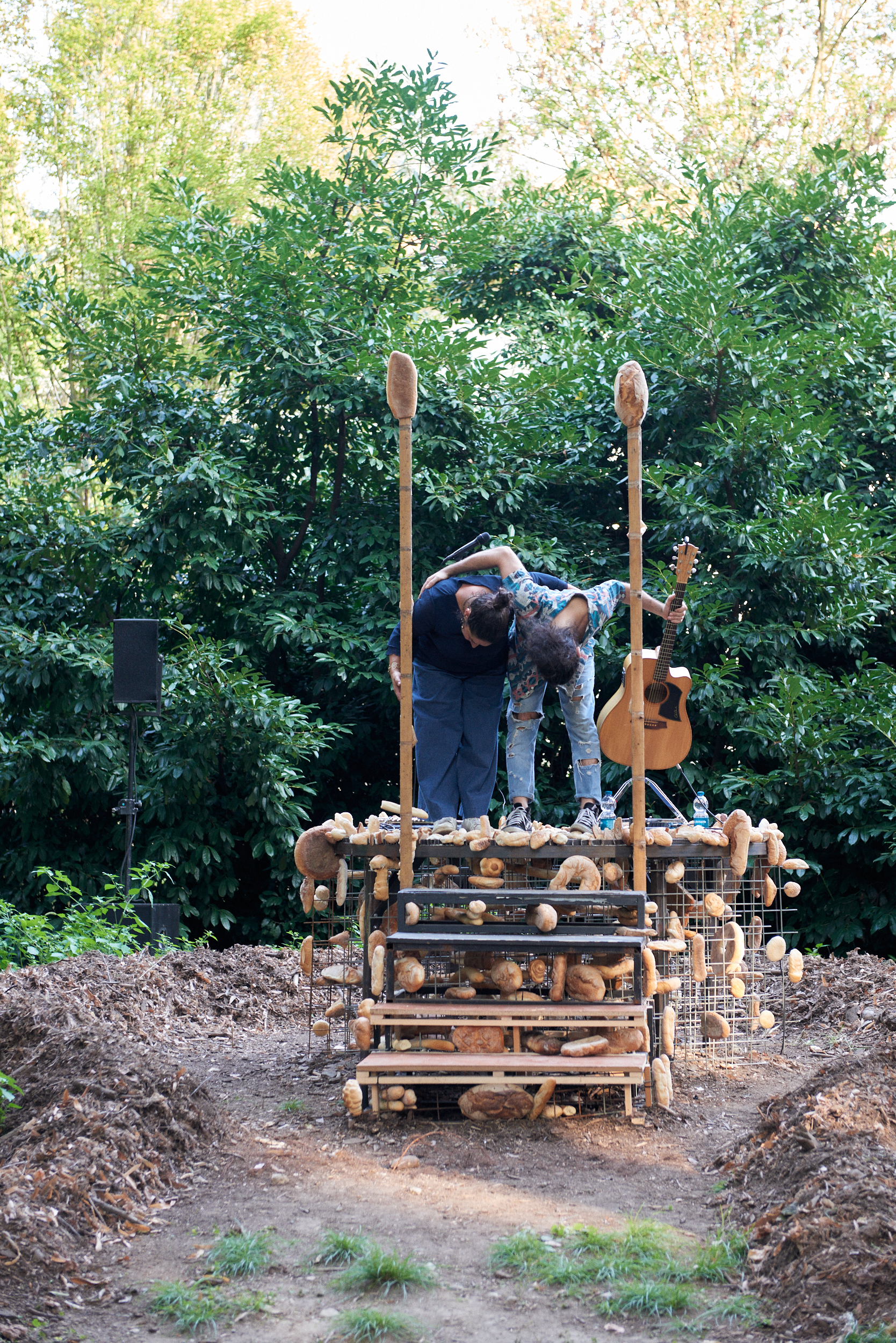 Un piccolo palco circolare fatto di pagnotte e materiali organici — pane come materia viva, fragile e sacra — che diventa metafora di temporalità e trasformazione. Nuti ne fa un corpo scultoreo attraversato dall’idea del ciclo naturale, mentre Corrias ne restituisce la dimensione sonora, con un set essenziale in cui voce e flauto si intrecciano in un ritmo che è respiro, vento e canto insieme. «Il pane, nella cultura sarda, è uno dei simboli dell’esistenza stessa», spiega Corrias. E nel Godai Fest questo simbolo diventa linguaggio universale: alimento, scultura, suono.