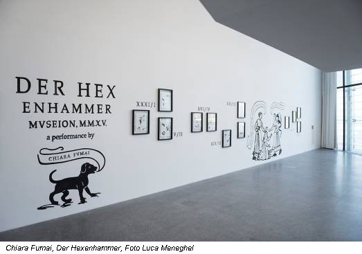 La Project Room di Museion è invece dedicata al progetto “Der Hexenhammer” di Chiara Fumai (a cura di Frida Carazzato), che si compone di un grande wall painting e di una performance che verrà replicata periodicamente fino al termine della mostra. La rappresentazione muraria si ispira alla figura dell’anarchica tedesca Ulrike Meinhof e cita scene dal Malleus Maleficarum, trattato medievale contro la stregoneria, mentre la performance entra in dialogo con la mostra di Rossella Biscotti invadendone gli spazi e guidando gli spettatori in un’inaspettata visita all’interno di Museion. Fumai, attraverso lo studio di rilevanti figure storiche ribelli femminili, vuole ribaltare la visione patriarcale che per secoli ha dominato e forse ancora oggi domina la società.